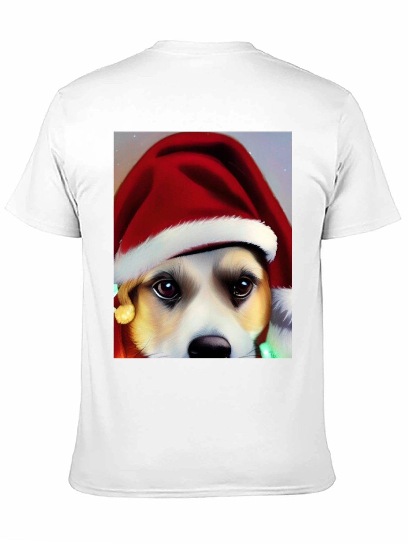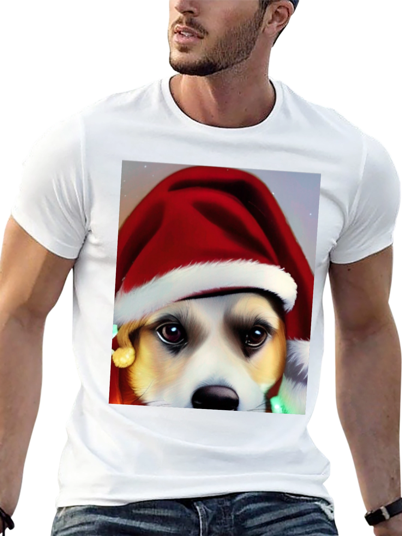 Spread some holiday cheer with this unique graphic tee! This black t-shirt features a festive image of a dog wearing a Santa hat, possibly a Corgi or similar breed, adorned with Christmas lights. The design is perfect for dog lovers and holiday enthusiasts alike. Made from comfortable material, this shirt is ideal for casual wear during the Christmas season or year-round for those who love a touch of festive fun. Its unique design makes it a great conversation starter at holiday parties or a fun addition to your everyday wardrobe.