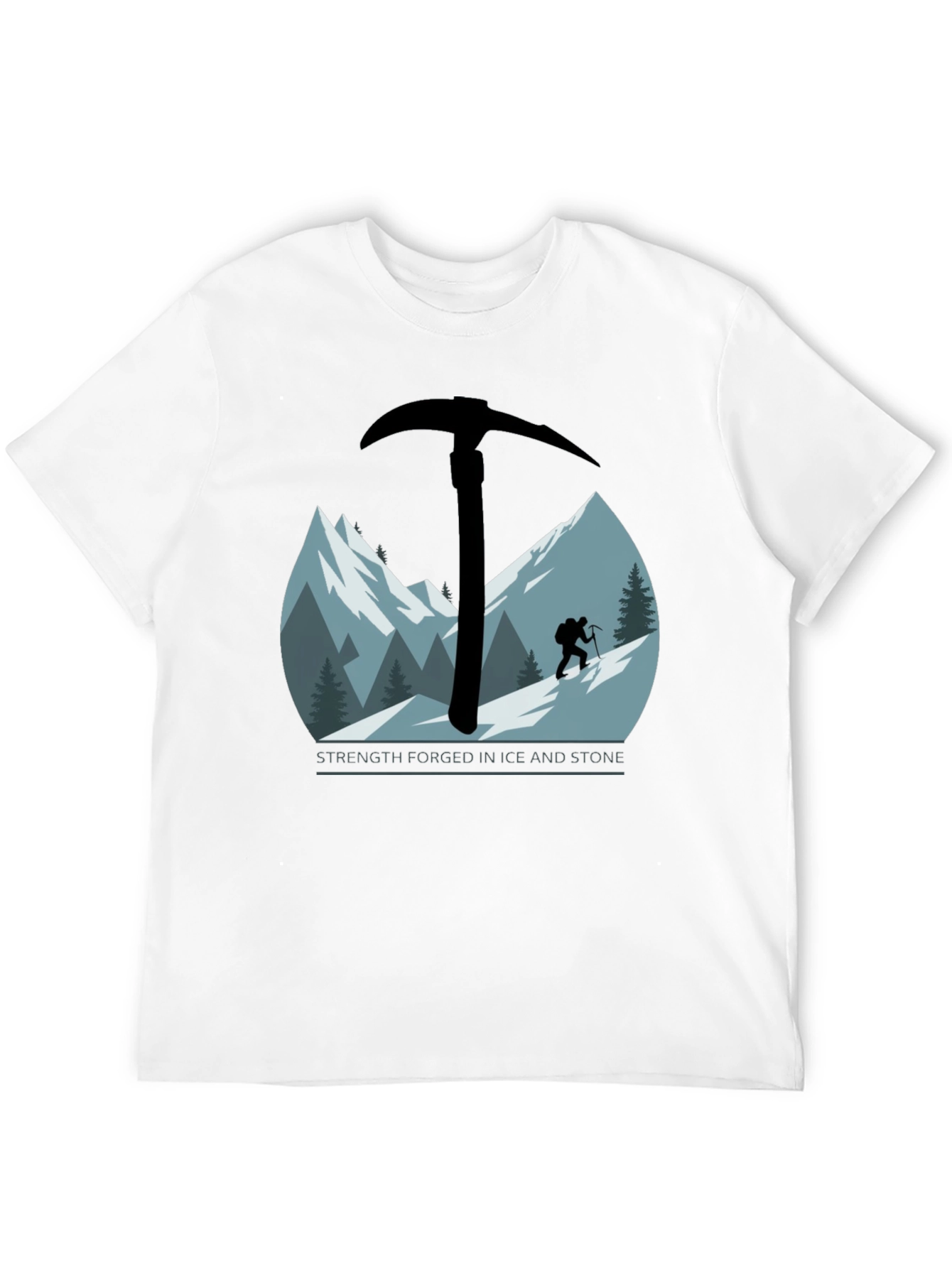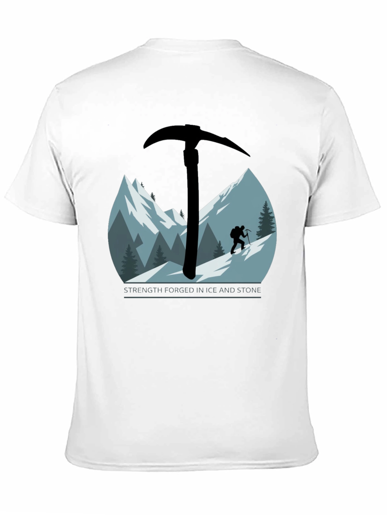 Embrace your love for adventure with this striking graphic t-shirt. Featuring a bold design of a climbing ice axe silhouetted against a mountainous backdrop, this tee is perfect for outdoor enthusiasts. The phrase "Strength Forged in Ice and Stone" is printed below. The shirt appears to be made of a comfortable, breathable fabric, and its classic fit makes it suitable for everyday wear or active pursuits. Whether you're hiking, camping, or simply want to showcase your passion for mountaineering, this t-shirt is a stylish and durable choice.