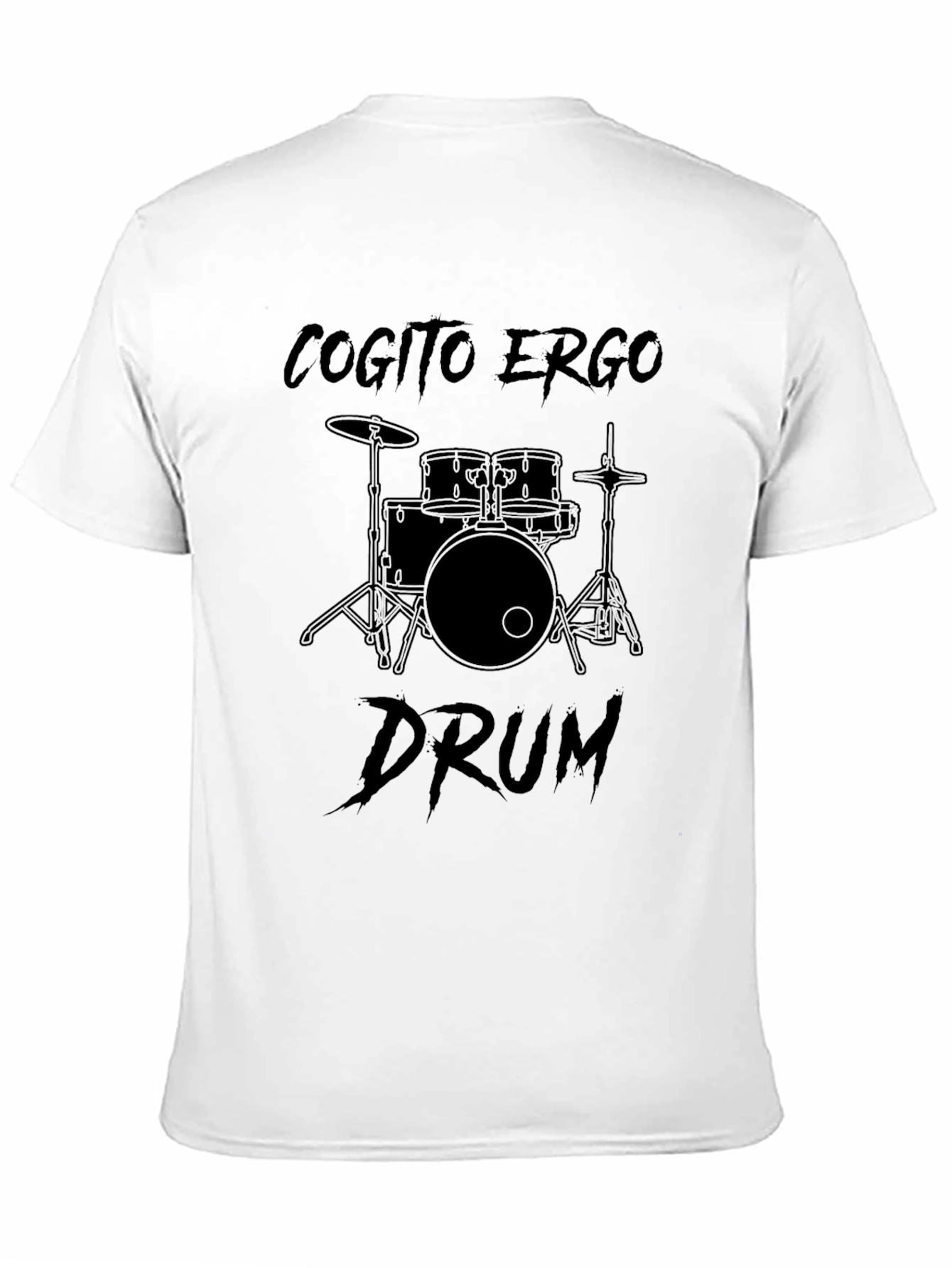 Show off your love for philosophy and drumming with this cool black T-shirt! The shirt features a stylized graphic of a drum set along with the text "Cogito Ergo Drum", a playful twist on the famous philosophical statement. Made from comfortable fabric, this tee is perfect for casual wear, band practice, or your next concert. Get ready to spark conversations and showcase your unique style. A must-have for any drummer or philosophy enthusiast!