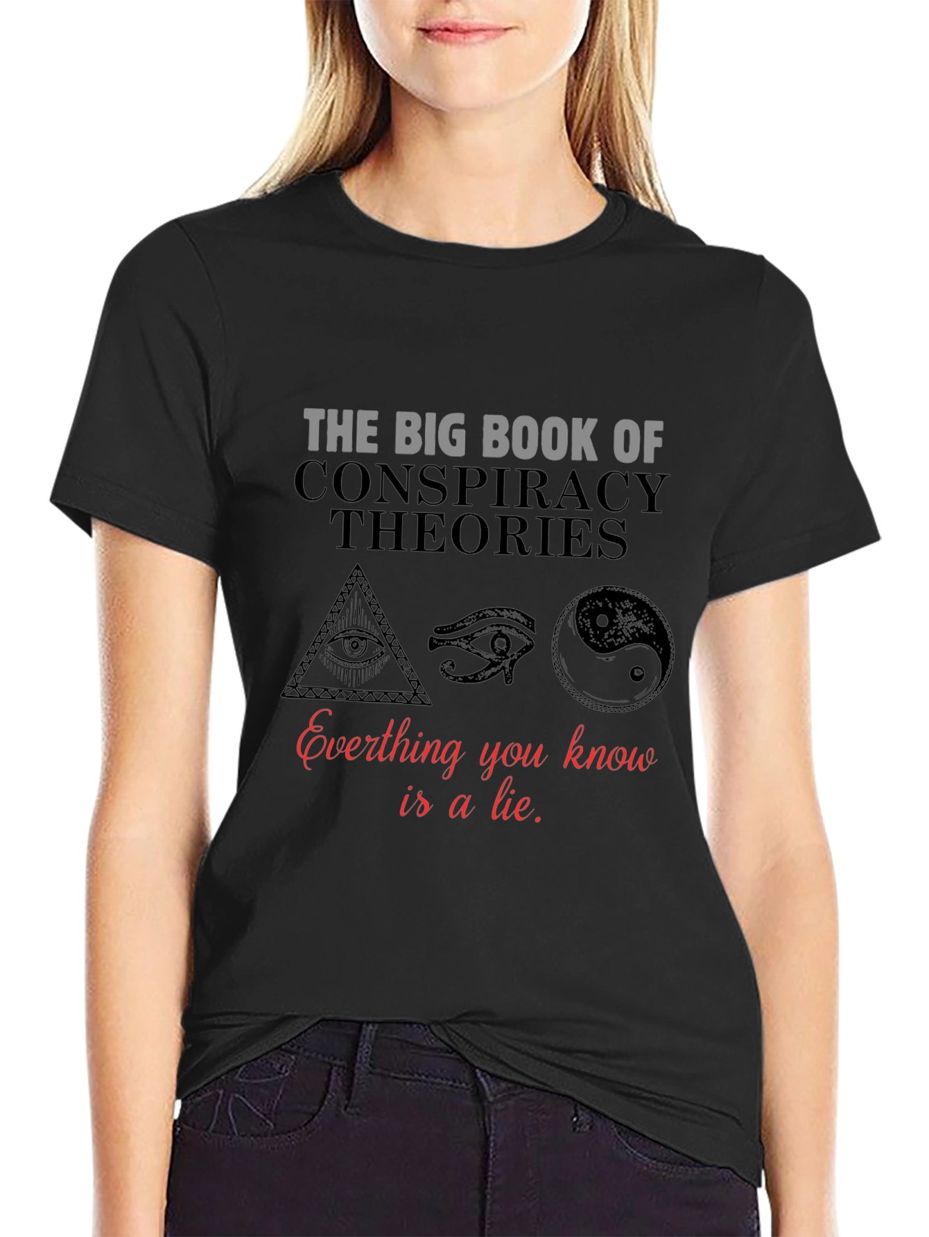 Delve into the world of hidden knowledge with this intriguing black t-shirt. Featuring the bold statement "The Big Book of Conspiracy Theories," this tee displays iconic symbols. Below, the provocative message "Everything you know is a lie" adds an element of mystery. Crafted from a comfortable-looking fabric, it's perfect for everyday wear. Make a statement and spark conversation wherever you go. This unique tee is ideal for those interested in alternative knowledge and questioning mainstream narratives. Step into the unknown!