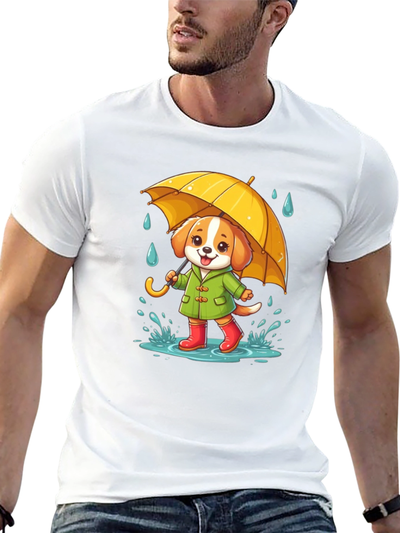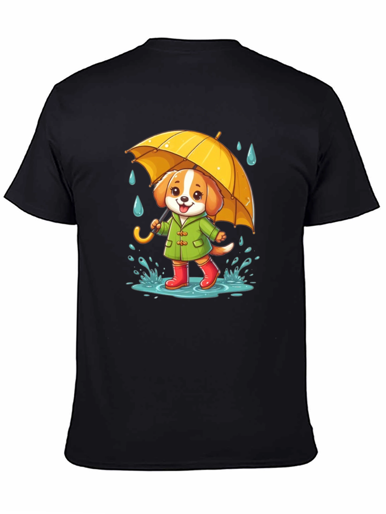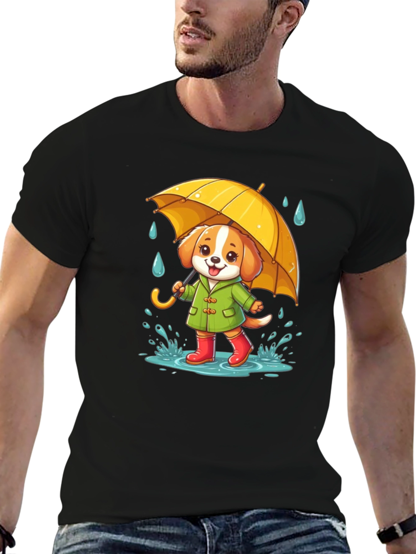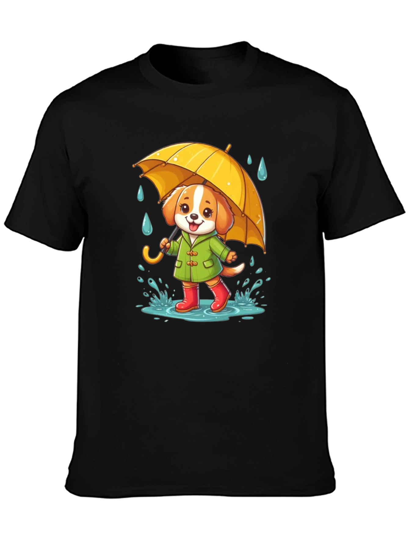 Brighten up your day with this adorable t-shirt featuring a cartoon dog in a rain outfit! The design shows a happy puppy holding a yellow umbrella, wearing a green raincoat and red boots, all while splashing in puddles. This cheerful graphic is printed on a comfortable black tee. Perfect for dog lovers, rainy day enthusiasts, or anyone who enjoys a touch of whimsy in their wardrobe. Made with soft, breathable fabric for all-day comfort. Get yours today and spread some joy!