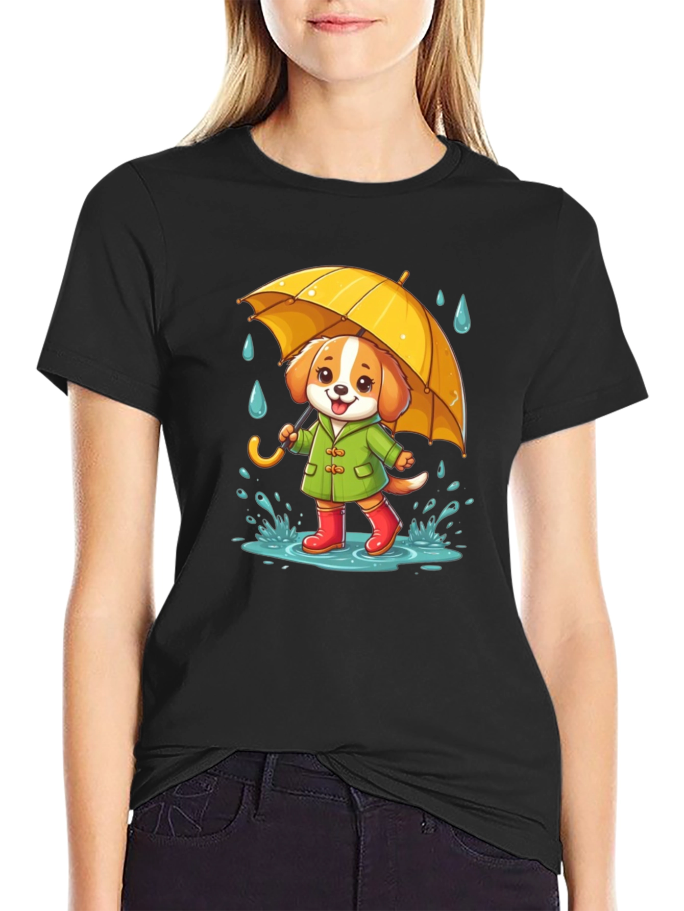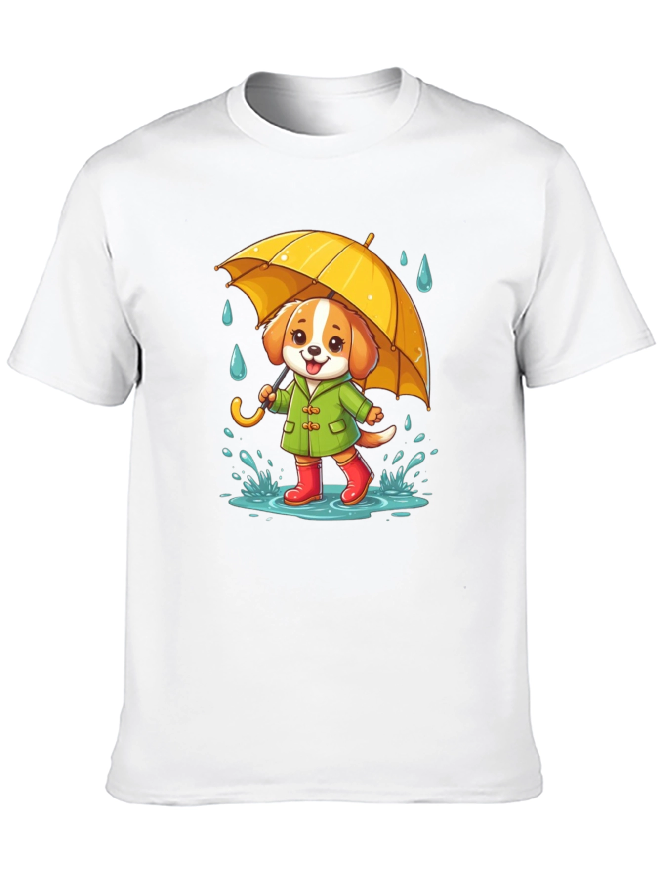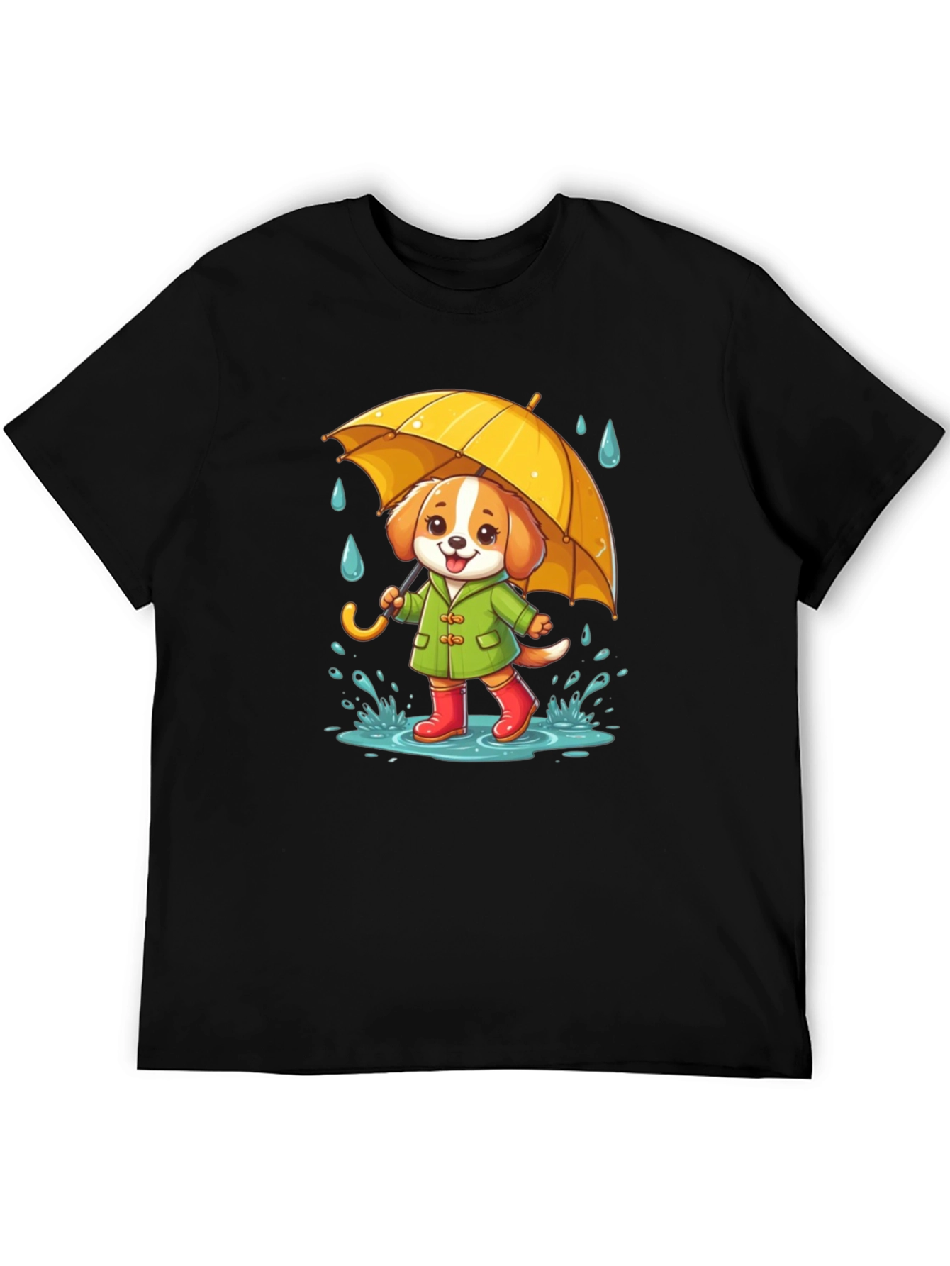 Brighten up your day with this adorable t-shirt featuring a cartoon dog in a rain outfit! The design shows a happy puppy holding a yellow umbrella, wearing a green raincoat and red boots, all while splashing in puddles. This cheerful graphic is printed on a comfortable black tee. Perfect for dog lovers, rainy day enthusiasts, or anyone who enjoys a touch of whimsy in their wardrobe. Made with soft, breathable fabric for all-day comfort. Get yours today and spread some joy!