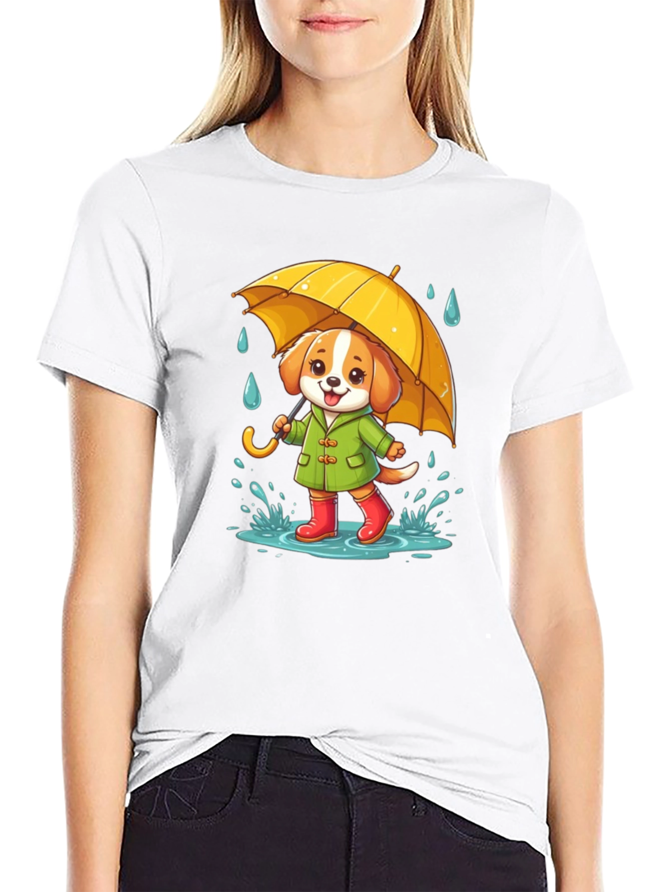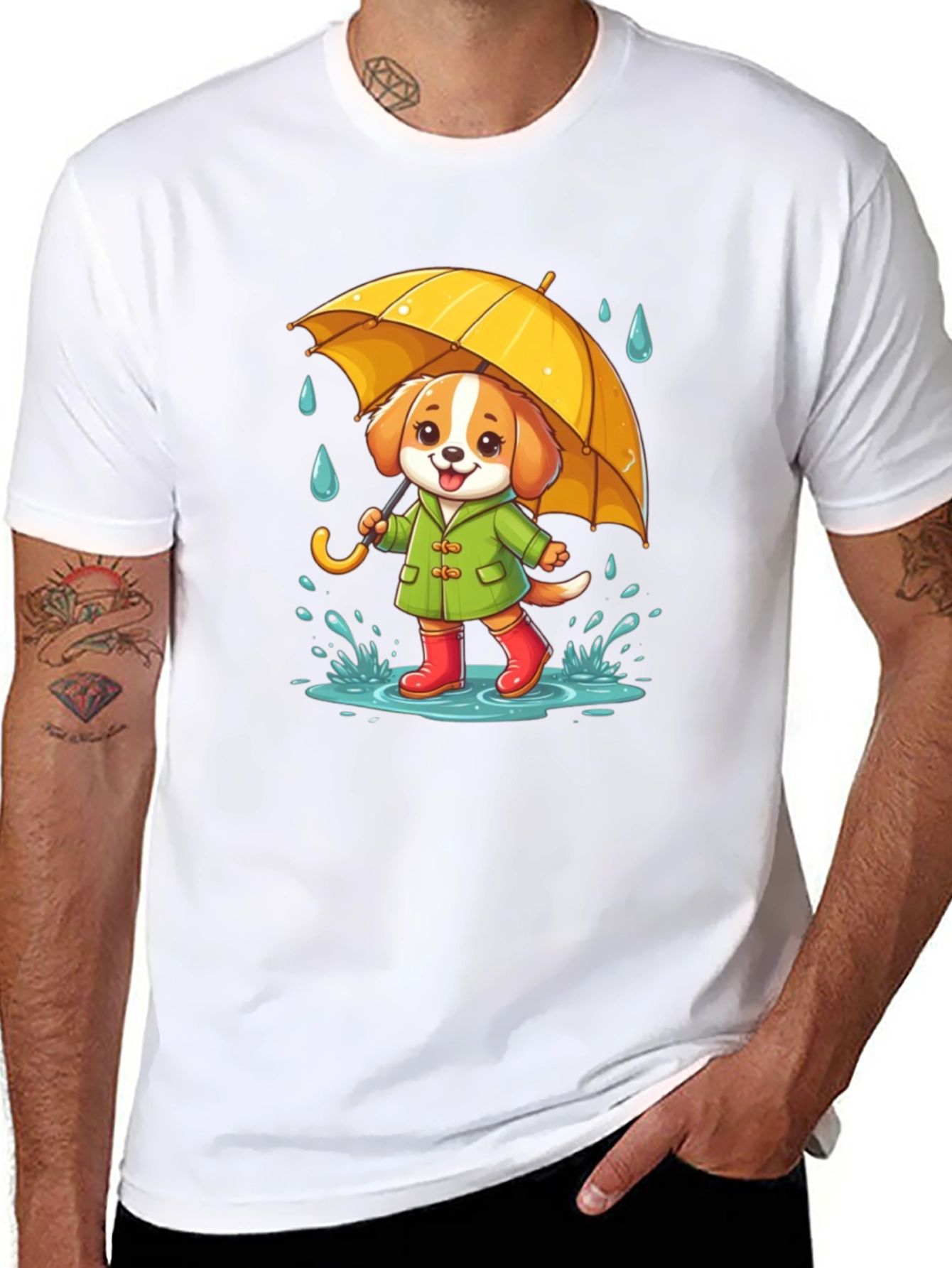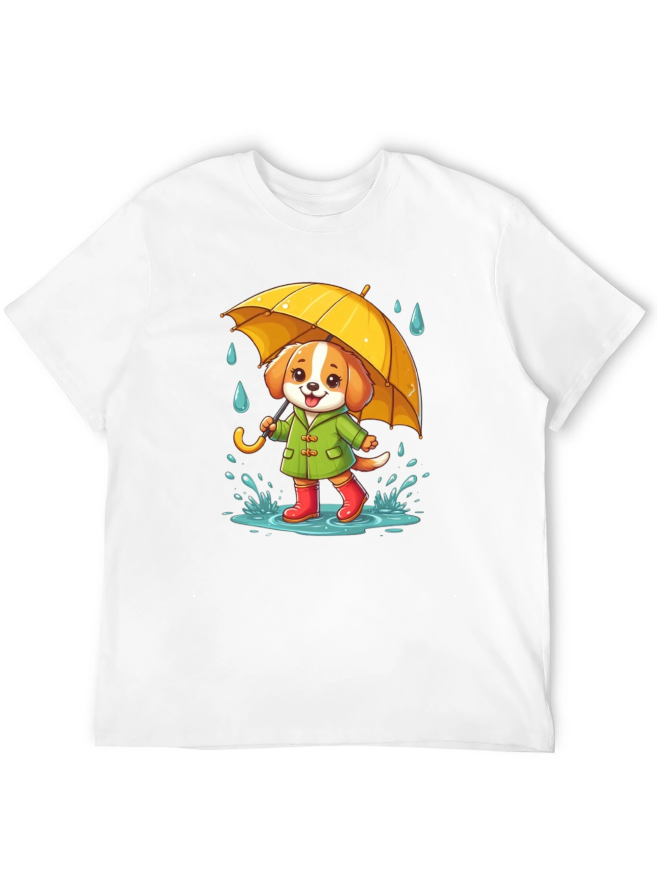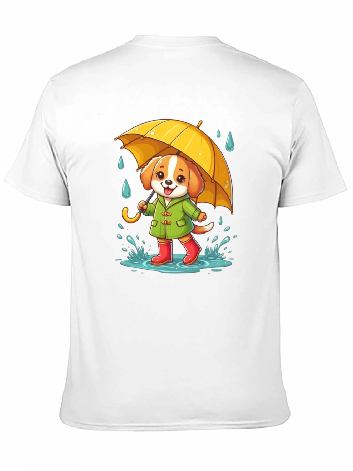 Brighten up your day with this adorable t-shirt featuring a cartoon dog in a rain outfit! The design shows a happy puppy holding a yellow umbrella, wearing a green raincoat and red boots, all while splashing in puddles. This cheerful graphic is printed on a comfortable black tee. Perfect for dog lovers, rainy day enthusiasts, or anyone who enjoys a touch of whimsy in their wardrobe. Made with soft, breathable fabric for all-day comfort. Get yours today and spread some joy!