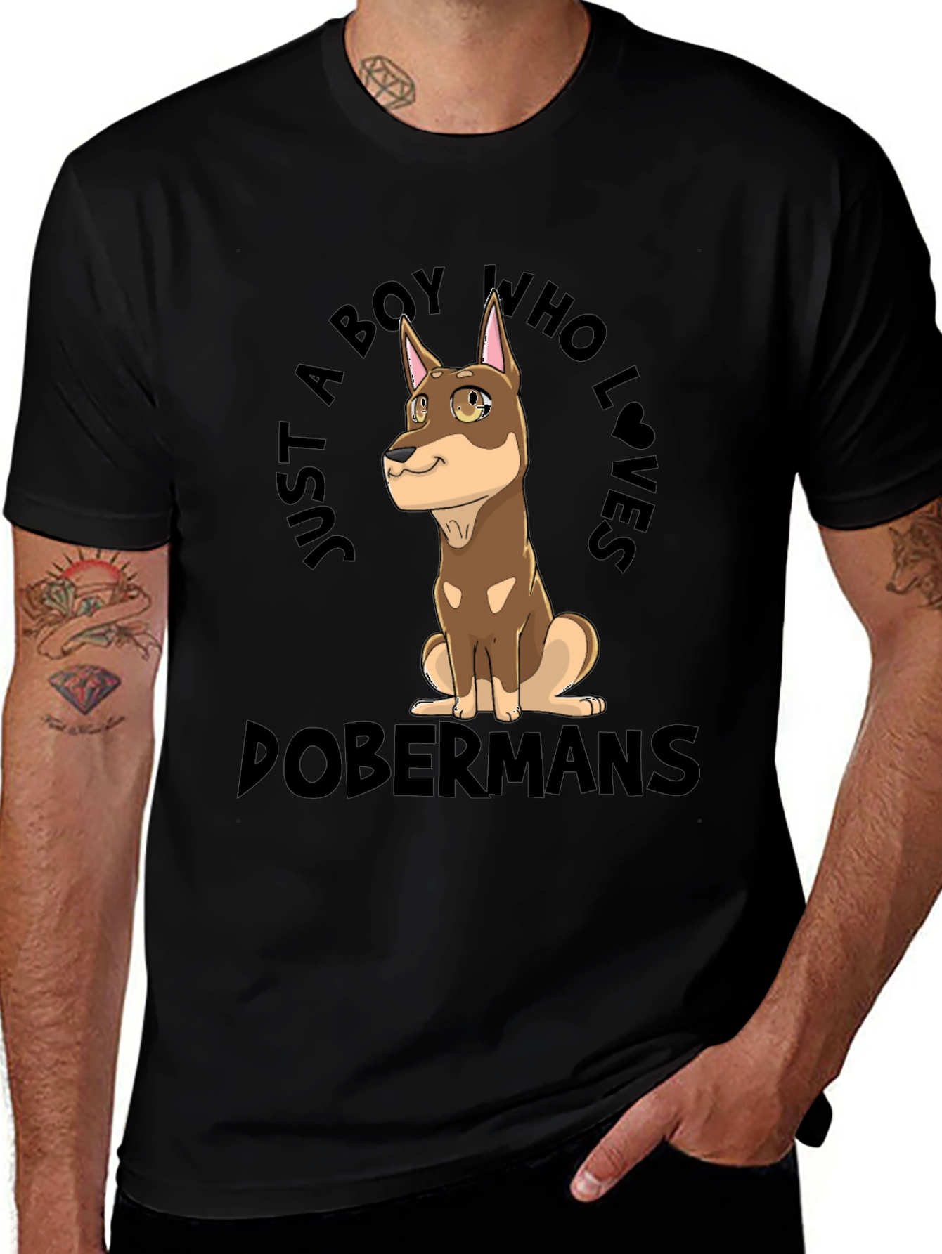 Show your love for Dobermans with this unique graphic t-shirt. The black tee features a charming cartoon Doberman illustration surrounded by the phrase "Just a Boy Who Loves Dobermans." This comfortable, casual shirt is perfect for everyday wear, dog walks, or casual outings. Made from a soft-looking fabric, this tee offers both style and comfort. A great gift for Doberman owners or anyone who adores these loyal companions. Express your passion for dogs in a fashionable way!