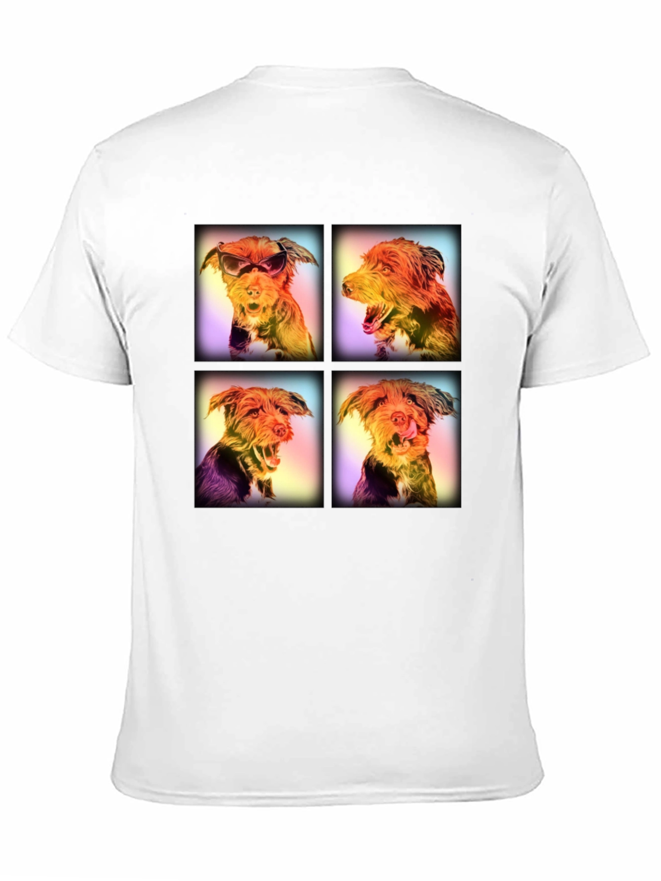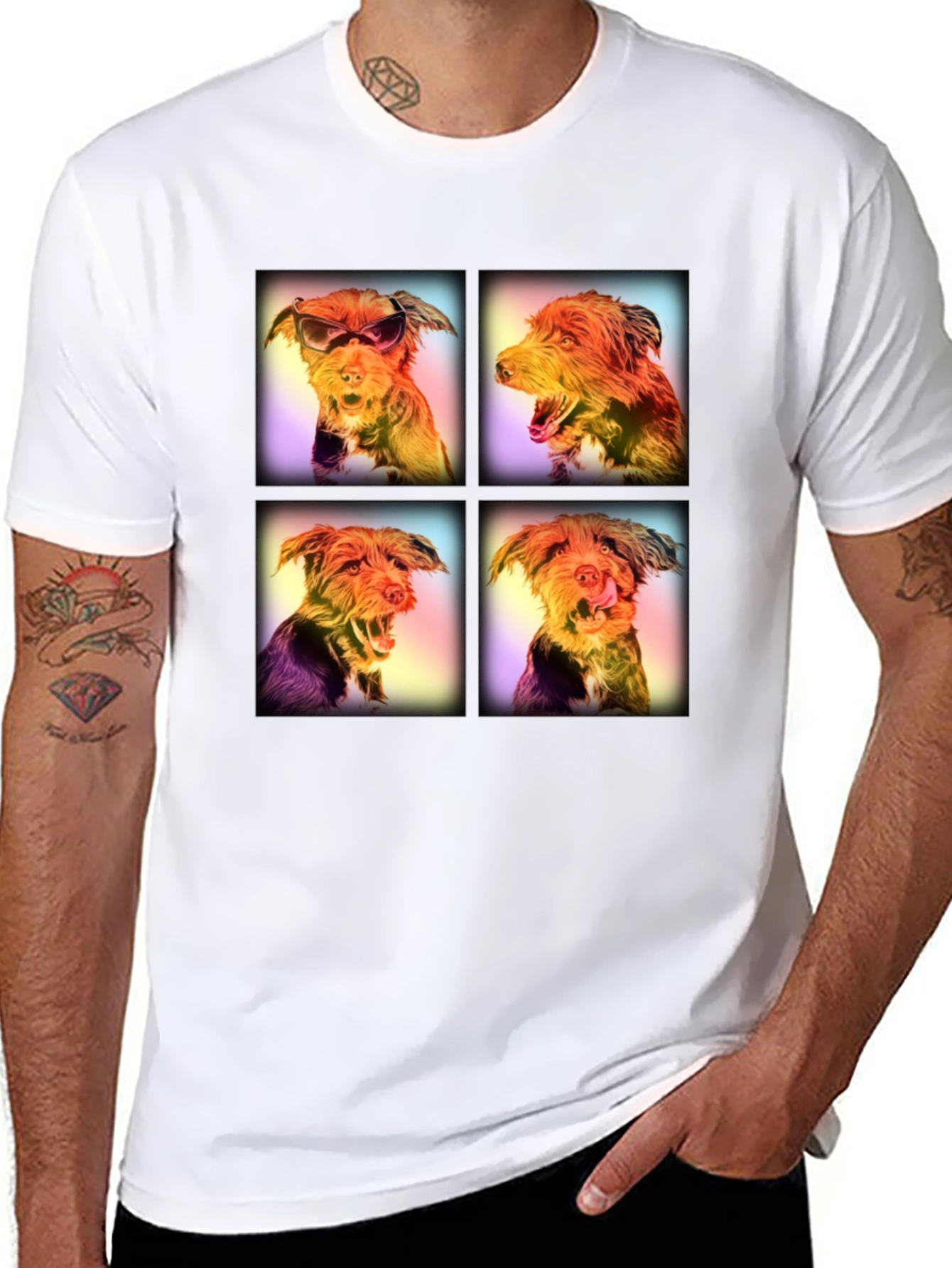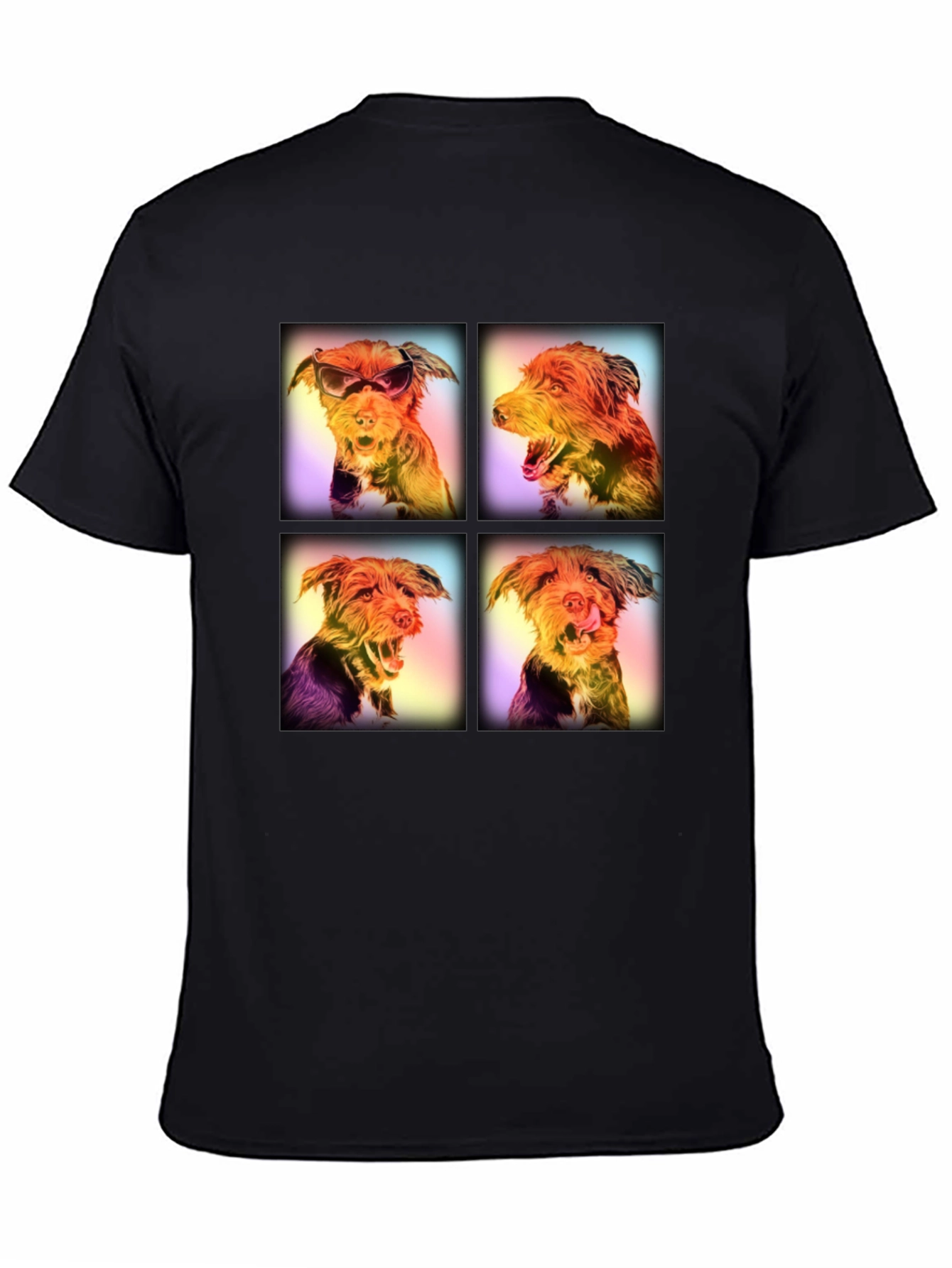 Show off your love for dogs with this unique black t-shirt. The eye-catching design features a colorful, artistic portrait of a dog in four different poses, adding a touch of whimsy and personality to your wardrobe. This casual tee is perfect for everyday wear, dog walks, or as a fun gift for dog lovers. Made from a soft, comfortable fabric, it’s sure to become a favorite. Stand out from the crowd with this cool and quirky graphic tee!