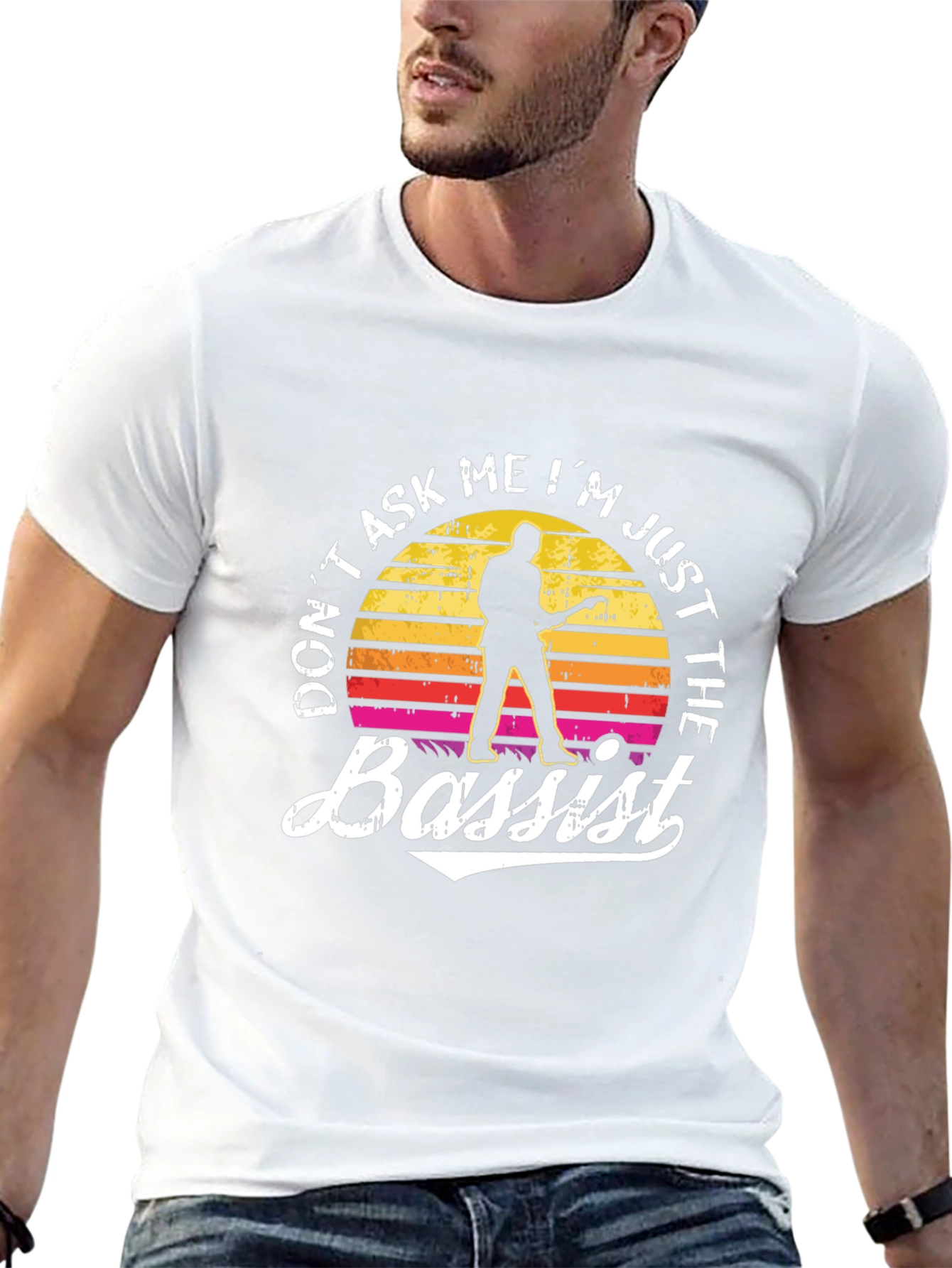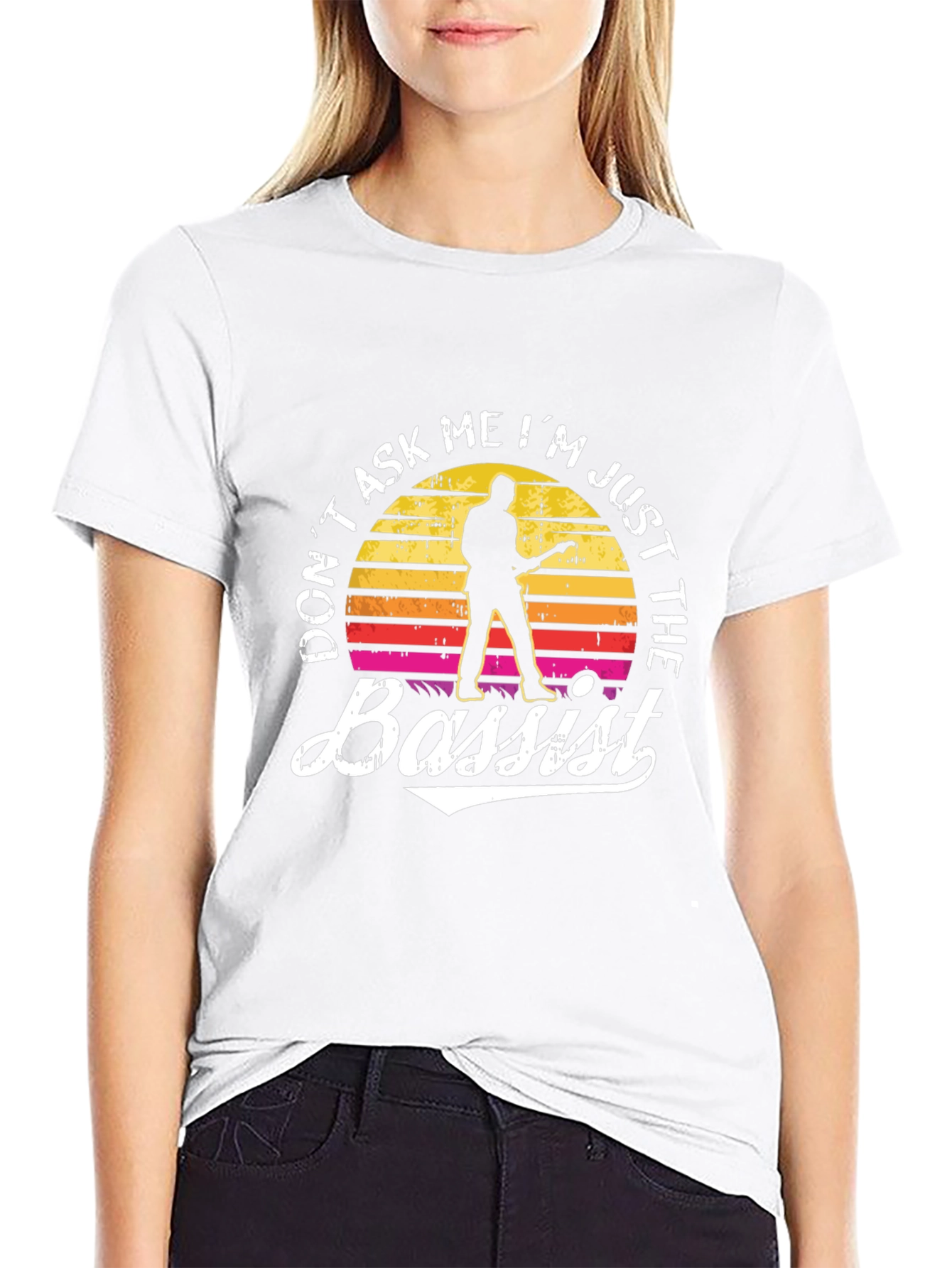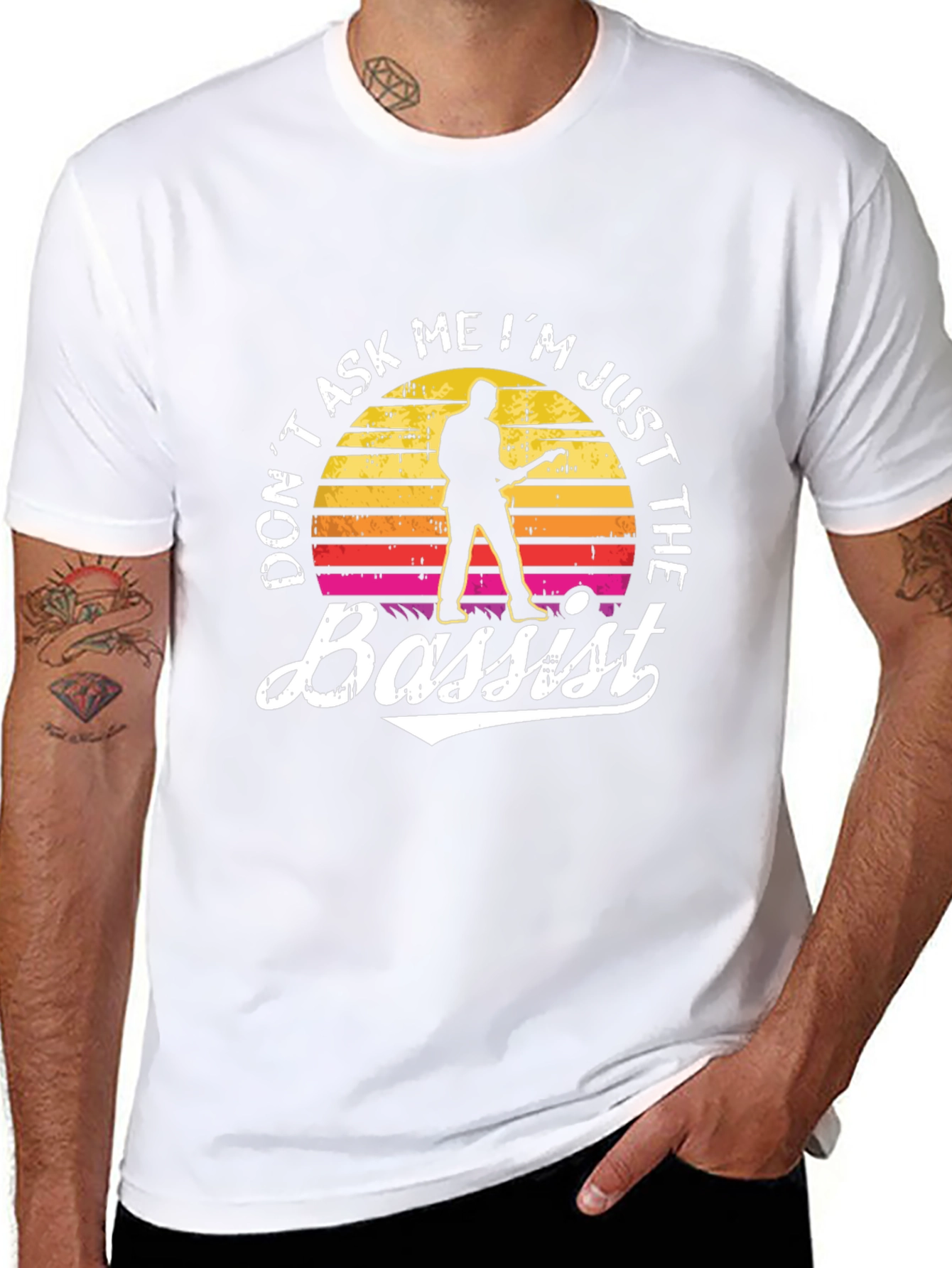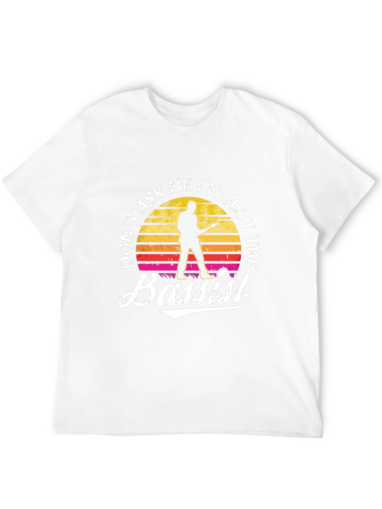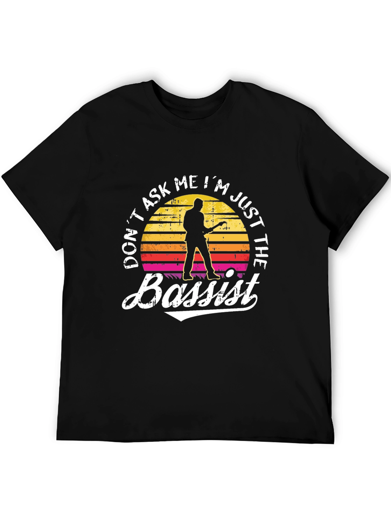 Show off your passion for music with this unique black t-shirt. Featuring a vintage sunset design with a silhouette of a bassist, and the humorous slogan "Don't Ask Me I'm Just The Bassist", this tee is perfect for any bass player. Crafted from a soft, comfortable fabric, it offers a great fit for everyday wear. Whether you're rehearsing, gigging, or just hanging out, this shirt is sure to get a laugh and spark conversation. A must-have for bassists with a sense of humor!