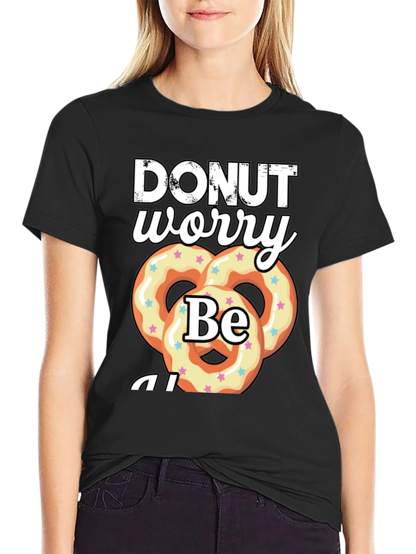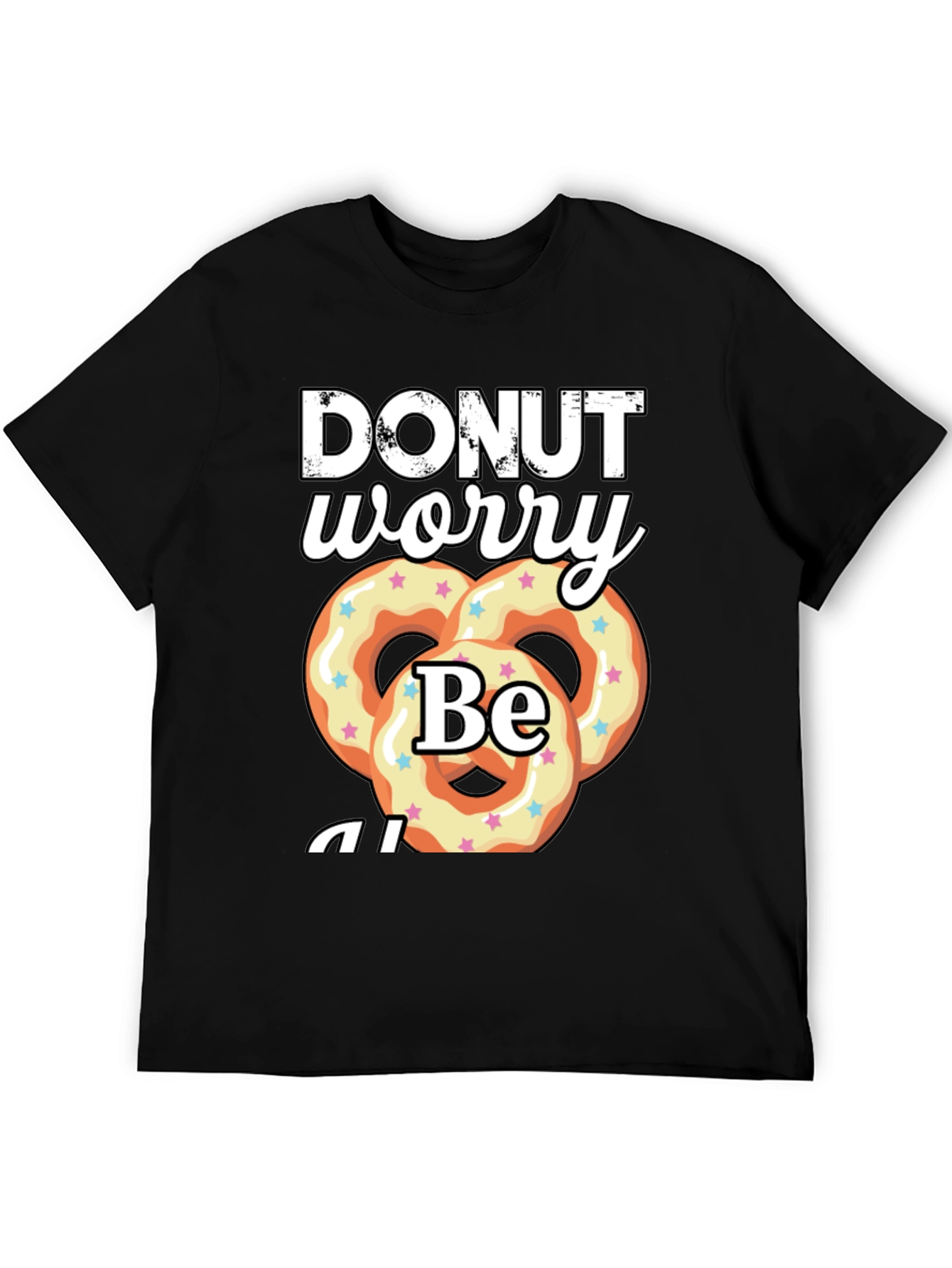 Spread positivity with this fun 'Donut Worry Be Happy' t-shirt. This black t-shirt features a playful graphic with the text "DONUT worry Be" and a set of colorful donut-shaped pretzels. The design is eye-catching and fun and can easily be paired with jeans for casual wear. It is a relaxed fit making it comfortable for all-day wear. It is perfect for casual outings, parties, or just relaxing at home. Grab yours today and add a dash of fun to your closet!