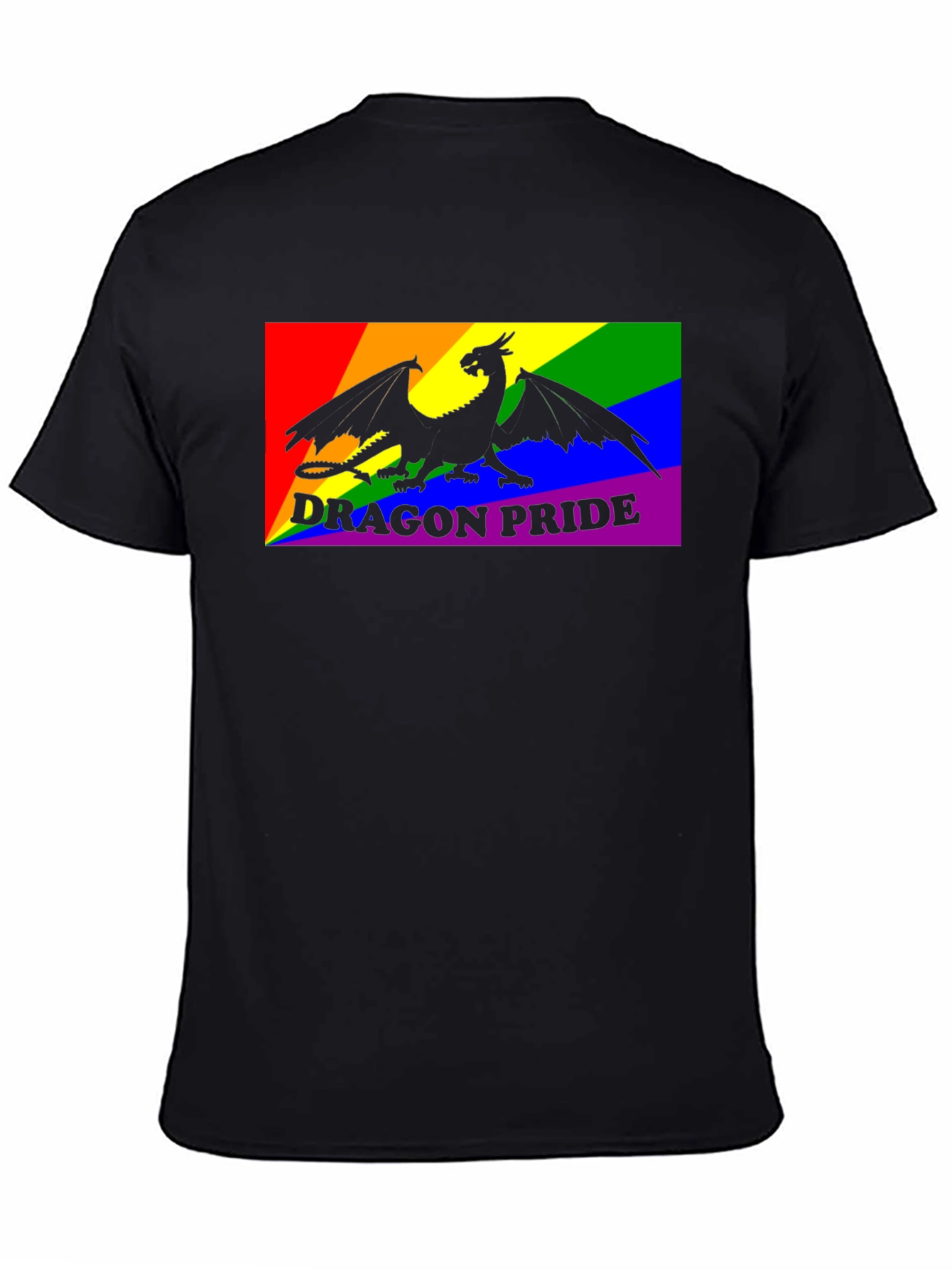 Show your pride with this unique graphic t-shirt. The design features a black dragon silhouette superimposed over a vibrant rainbow stripe background, accompanied by the text "DRAGON PRIDE". Made from a comfortable-looking black fabric, this tee is perfect for casual wear, pride events, or as a statement piece. Its bold and eye-catching design is sure to spark conversations and showcase your support for the LGBTQ+ community. Dress it up or down - this versatile shirt is a must-have for anyone who wants to express themselves.
