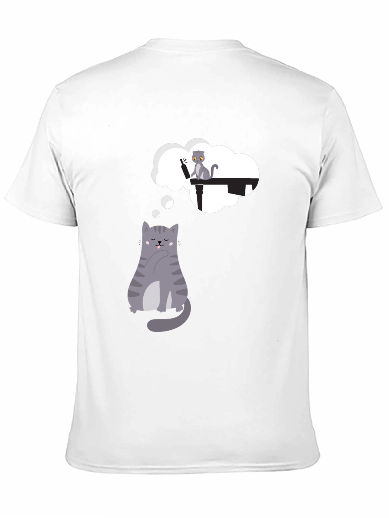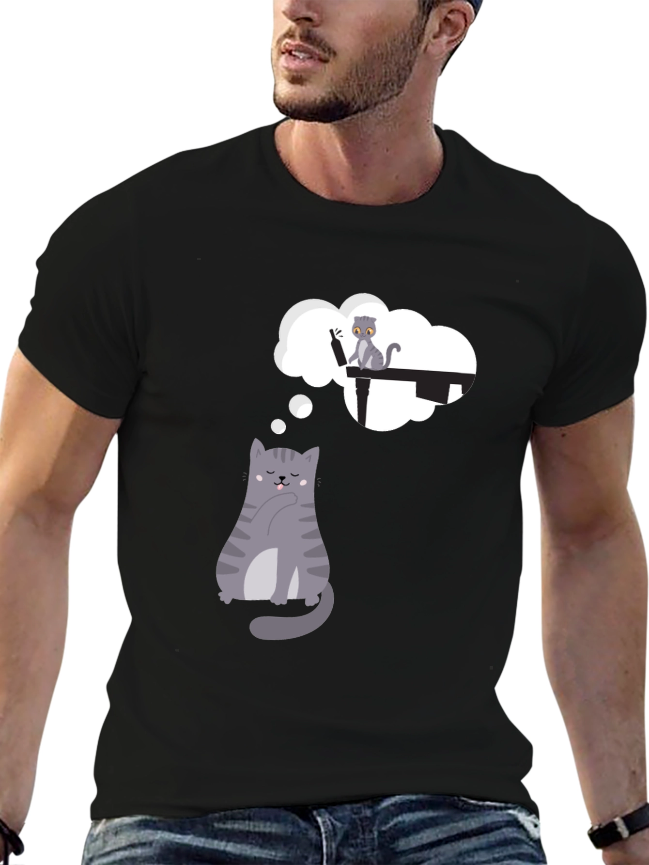 This stylish black t-shirt features a whimsical design of a cartoon cat deep in thought. Above the cat is a thought bubble showing another feline mischievously playing with a bottle on a table. The graphic is eye-catching and playful, perfect for cat lovers and those with a fun sense of style. Made from a comfortable-looking fabric, this tee appears soft and breathable. This unique tee is suitable for casual wear, weekend outings, or as a conversation starter at social gatherings. Pair it with jeans, shorts, or a skirt for a relaxed and trendy look.
