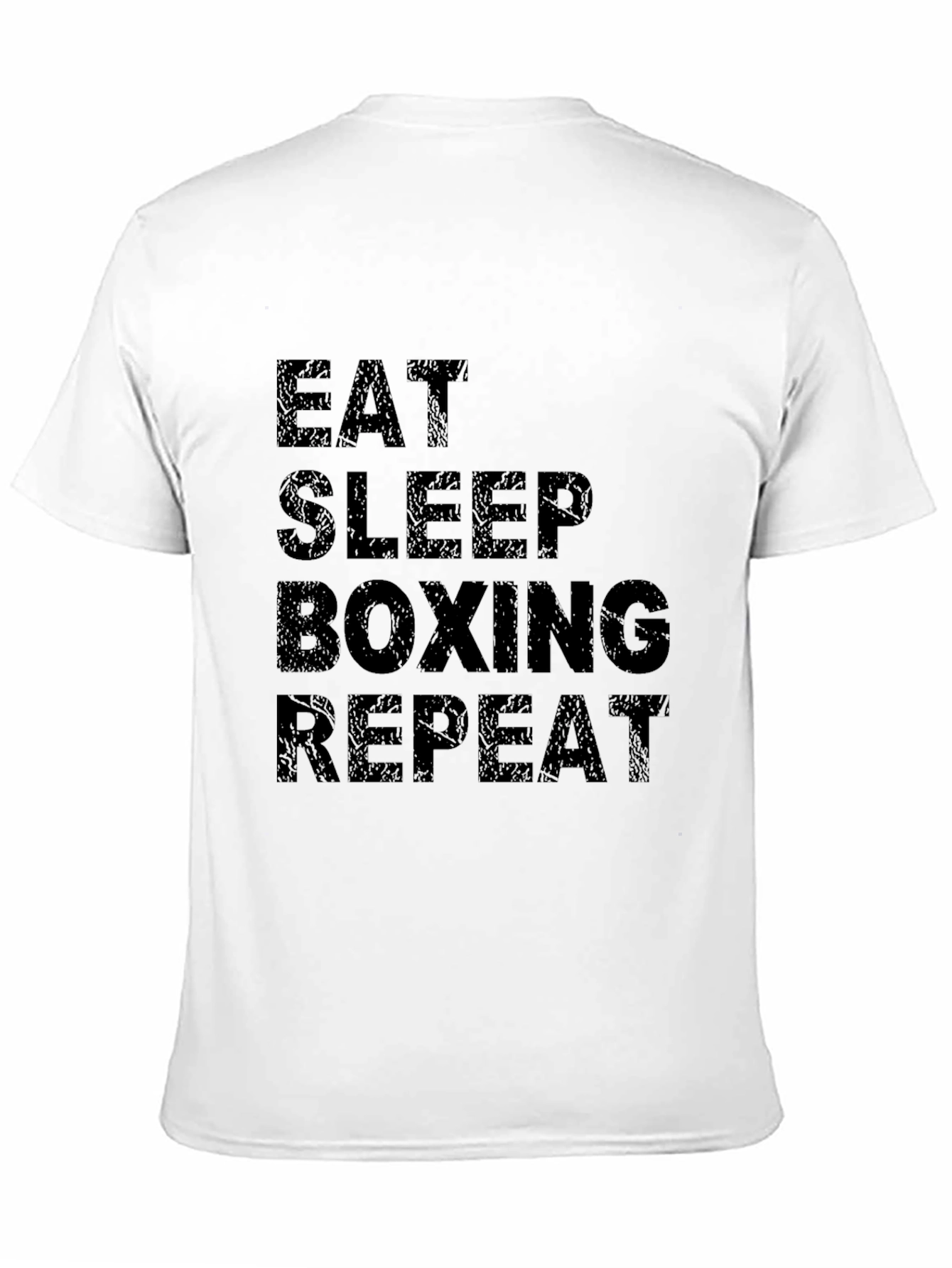This black t-shirt features a bold graphic print that reads "EAT SLEEP BOXING REPEAT". The print has a textured design. Made from soft, comfortable fabric, this tee offers both style and comfort. The classic crew neck and short sleeves make it a versatile addition to any casual wardrobe. Perfect for boxing enthusiasts, gym-goers, or anyone who loves a sporty, relaxed look, this t-shirt is ideal for everyday wear, workouts, or casual outings. Show off your passion for boxing with this eye-catching and comfortable t-shirt.
