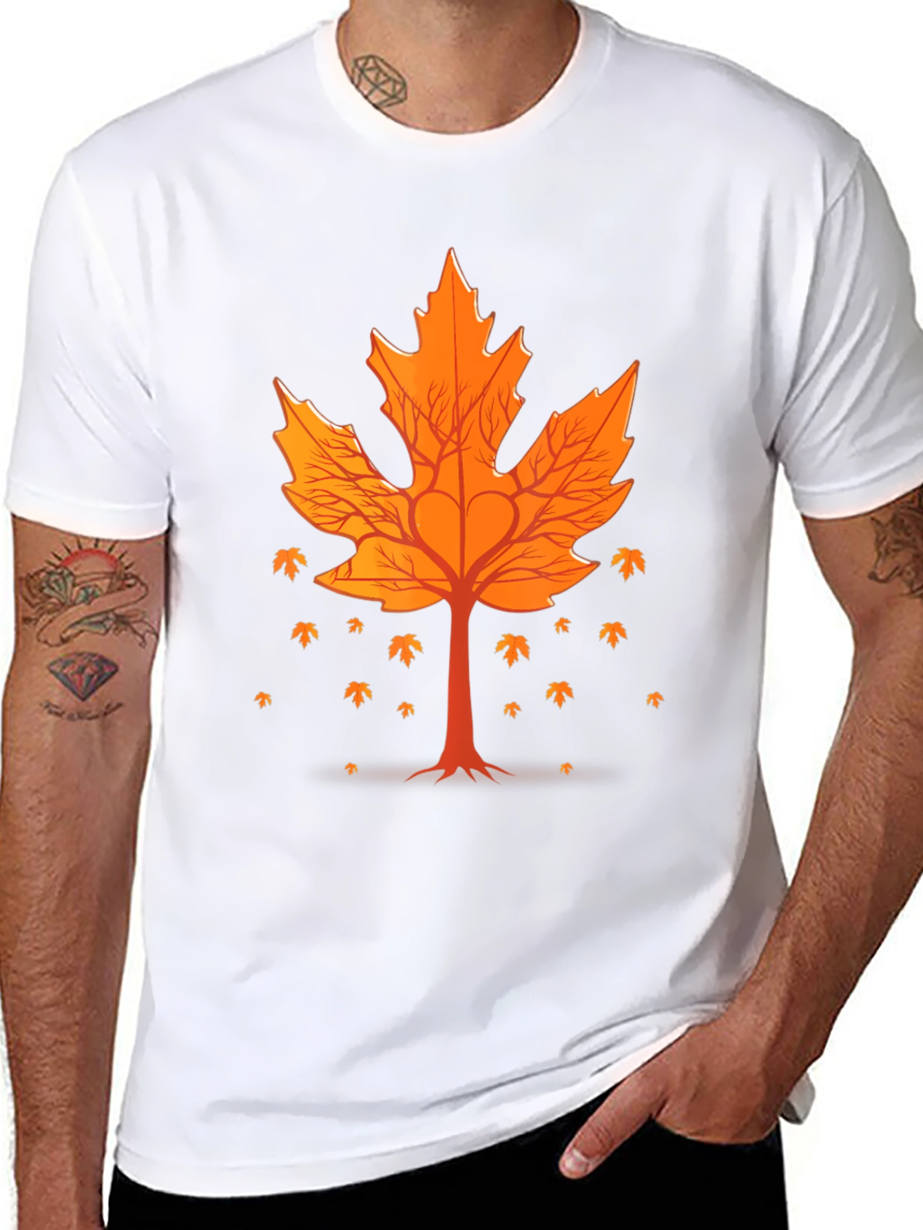 Embrace the autumn spirit with this stylish black t-shirt featuring a vibrant orange leaf tree design. The intricate leaf pattern combined with the tree branches creates a unique nature-inspired look. Made from a comfortable cotton blend, this tee is perfect for casual wear, outdoor adventures, or simply expressing your love for the fall season. The design features a full leaf design with smaller leaves falling from the tree. Stand out with this eye-catching and versatile graphic tee. A must-have addition to any nature lover's wardrobe.