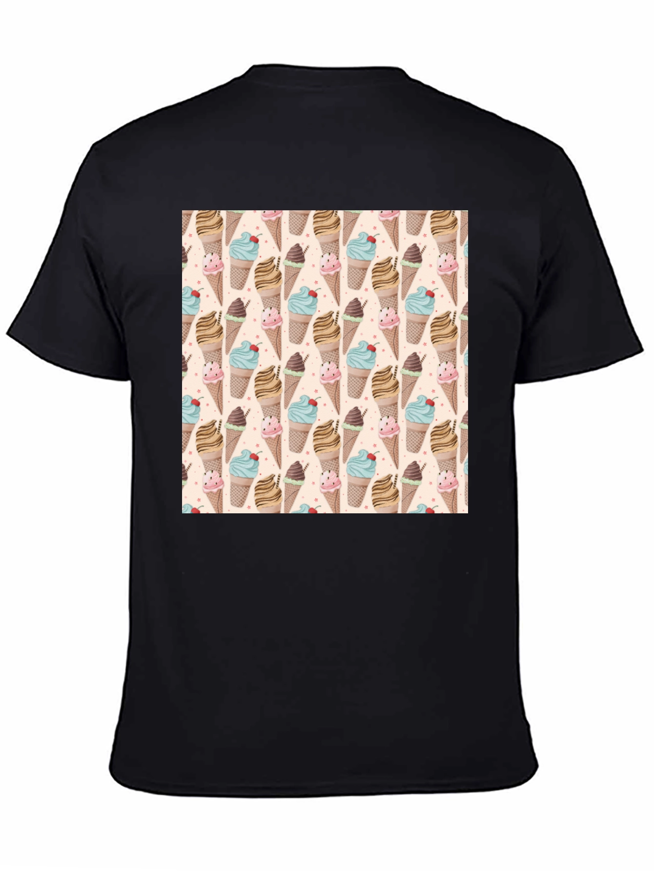 Stay cool and stylish with this unique black t-shirt featuring a fun and vibrant ice cream cone pattern. The eye-catching design includes a variety of colorful ice cream cones, perfect for adding a playful touch to your casual wardrobe. Made from a comfortable fabric, this tee is ideal for everyday wear, summer outings, or ice cream socials. Stand out from the crowd with this sweet and trendy statement piece!