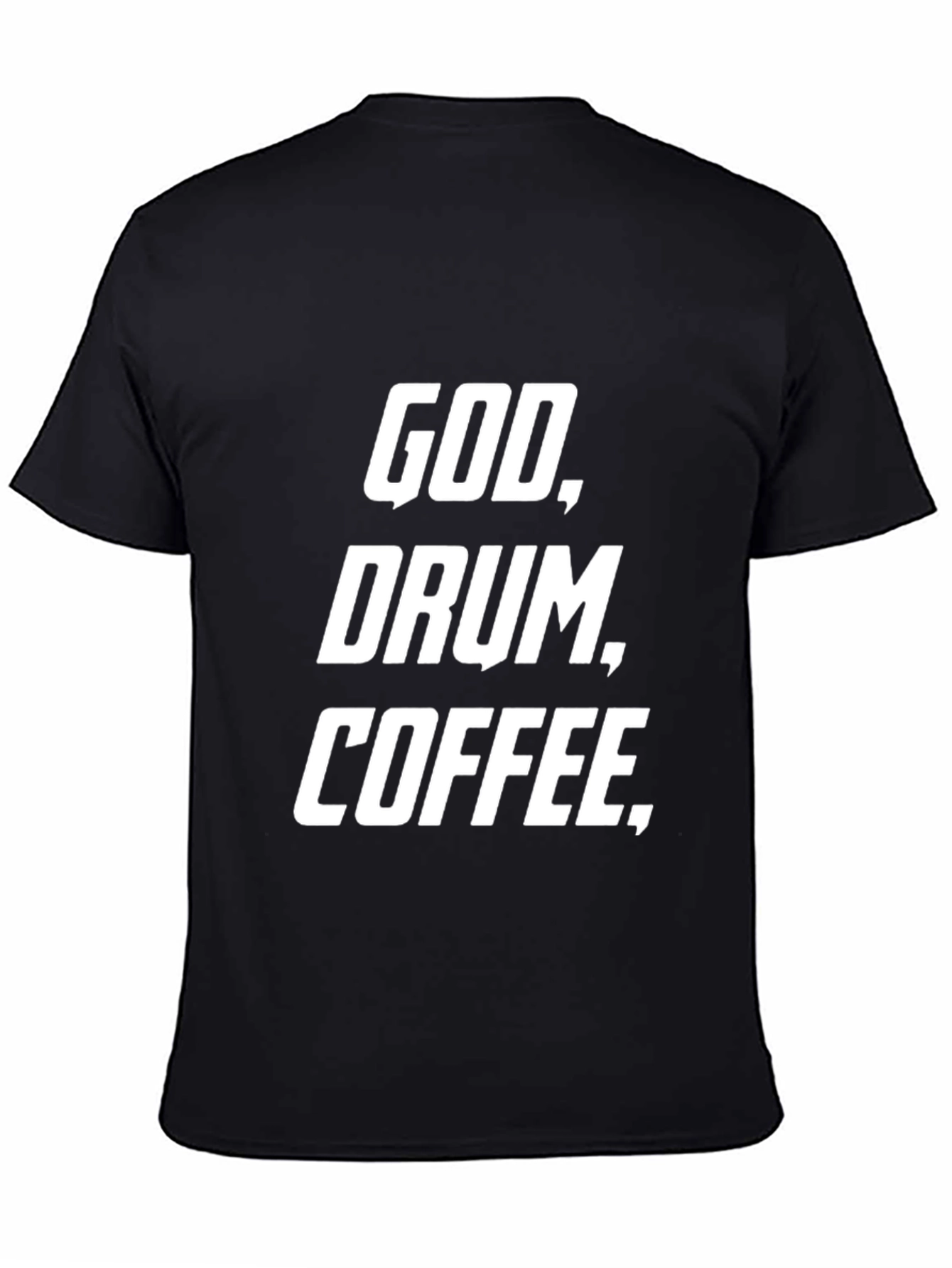 Express yourself with this cool black graphic tee! The shirt features the words "GOD, DRUM, COFFEE," printed in bold, white lettering. Crafted from comfortable fabric, it is perfect for casual everyday wear. The shirt’s design adds a touch of personality to your outfit. Pair it with jeans or shorts for a laid-back look, making it suitable for casual outings, band practices, or just lounging around the house. It’s a great way to showcase your interests. It also makes a unique gift for musicians and coffee lovers alike.