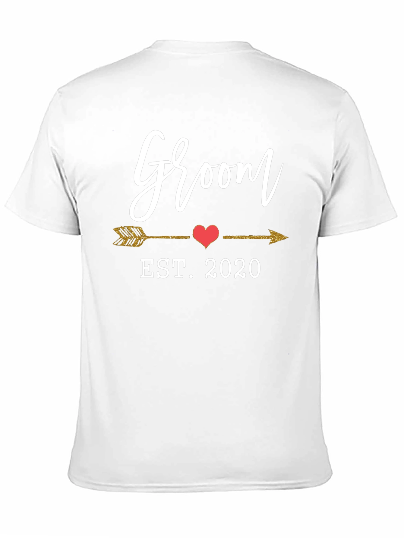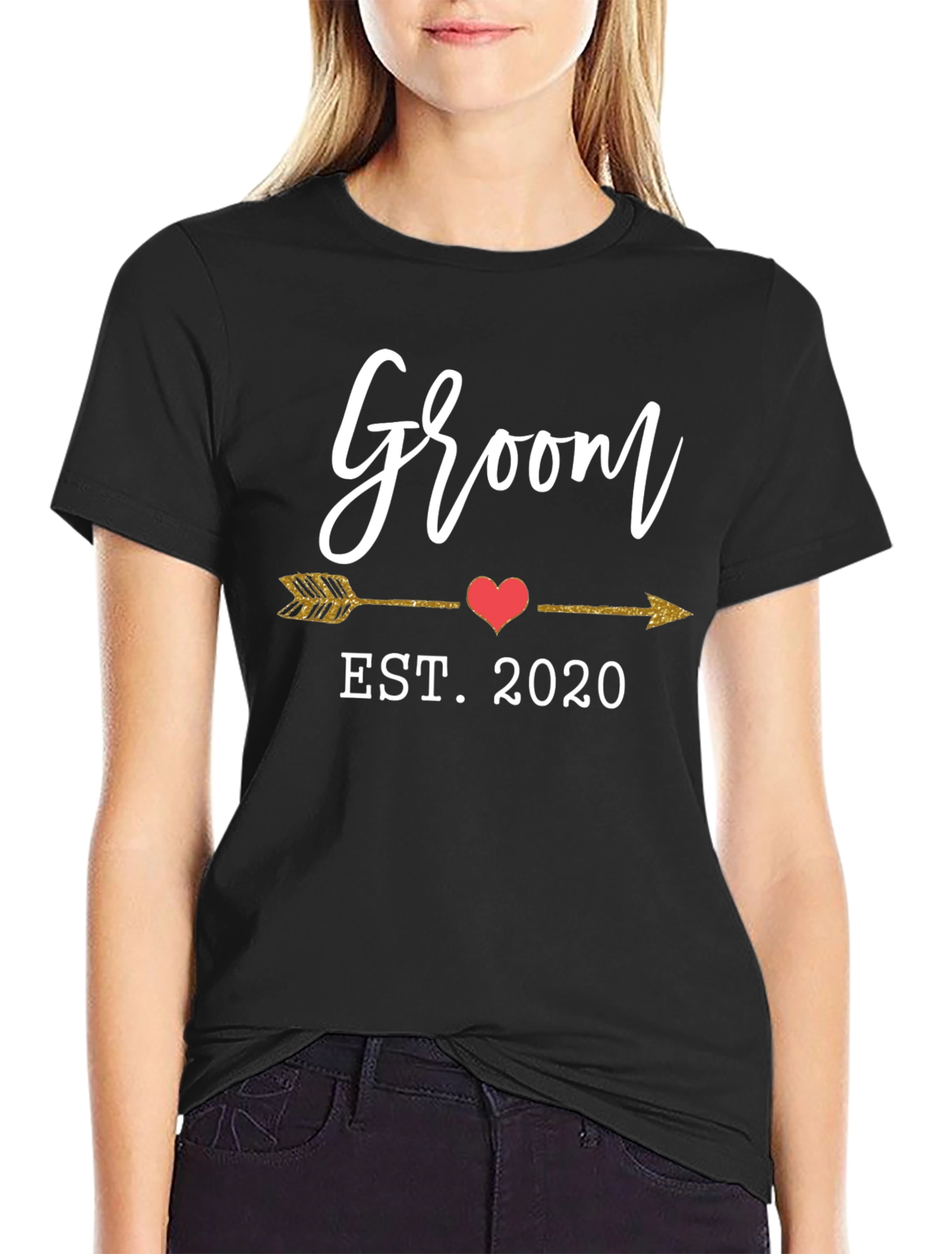 Celebrate your special year with this stylish black graphic tee! Featuring the word 'Groom' in elegant white script, this shirt also boasts a gold arrow with a red heart at its center, along with 'EST. 2020' beneath. Made from a soft, comfortable fabric, this t-shirt is perfect for pre-wedding events, wedding day attire, or even as a fun anniversary gift. Show off your groom status with this unique and eye-catching design. This shirt is sure to turn heads and make you feel confident and stylish as you embark on your journey of marital bliss. A perfect keepsake!