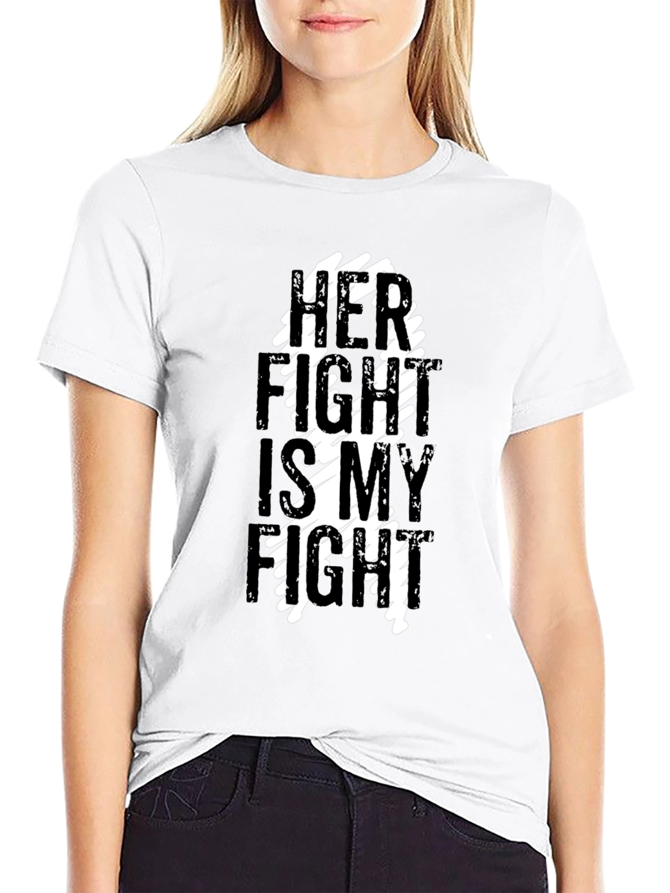 Show your support with this powerful statement tee. This black t-shirt features a bold white graphic that reads, "Her Fight is My Fight," making it a meaningful way to express solidarity. Crafted from a comfortable, breathable fabric, this shirt is perfect for everyday wear. The classic fit ensures a relaxed feel, while the eye-catching design makes a statement. Whether you're attending a rally, running errands, or simply want to show your support, this tee is a versatile addition to your wardrobe. Join the cause and wear your values with pride in this impactful graphic tee.