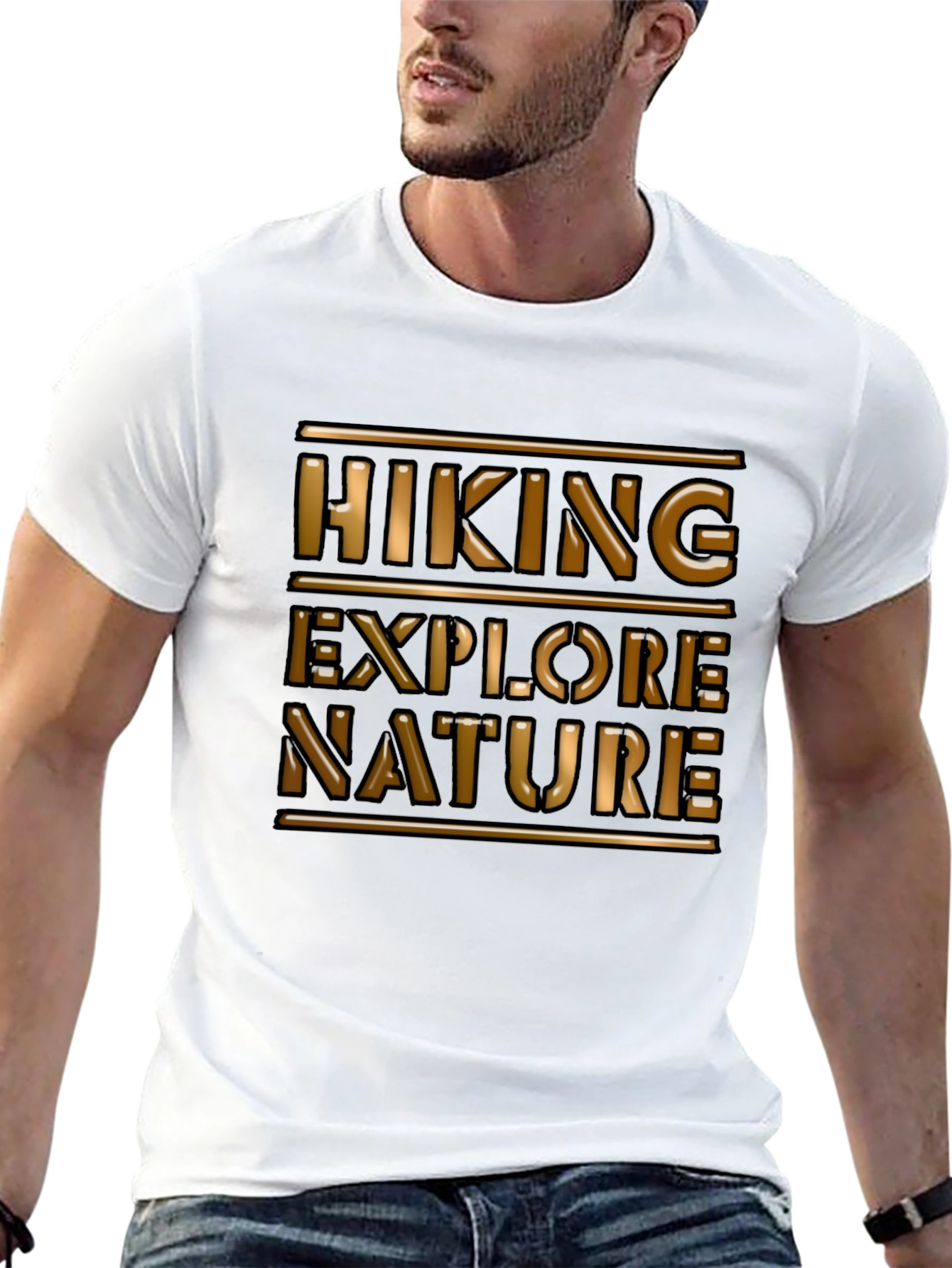 Embrace the spirit of adventure with this stylish black t-shirt. Featuring a bold, eye-catching design with the words "Hiking Explore Nature" in a vintage gold tone, this tee is perfect for outdoor enthusiasts. The design is framed with gold lines giving it a layered, 3D feel. Made from a soft, comfortable fabric, this tee offers both style and comfort. Ideal for hiking trips, casual outings, or simply expressing your love for nature, this tee is a must-have addition to your wardrobe. Wear it proudly and inspire others to explore the great outdoors!