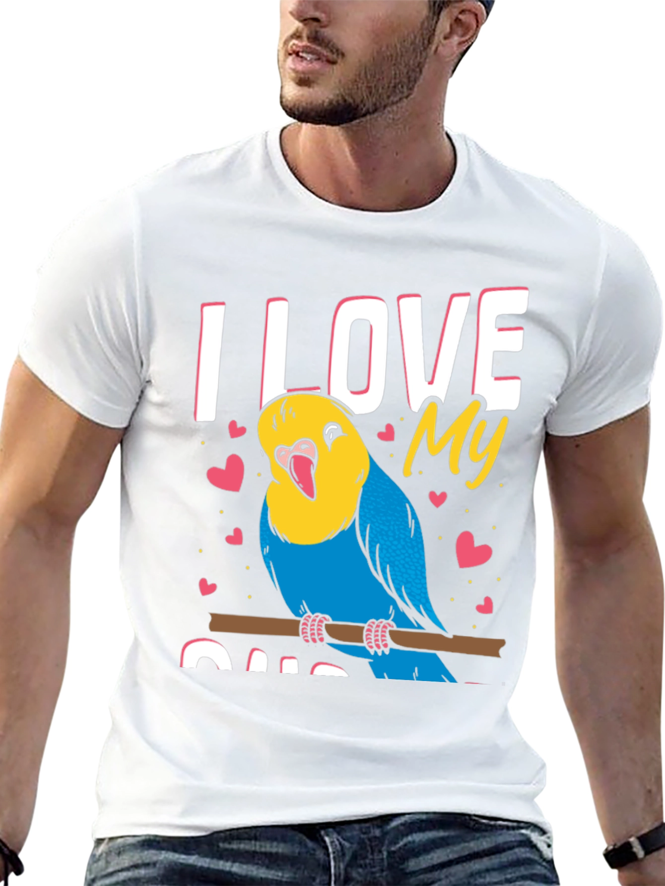 Show your love for your feathered friend with this charming "I Love My Bird" t-shirt. The design features a vibrant and colorful lovebird perched on a branch, surrounded by cute little hearts. The graphic is printed on a soft, comfortable black fabric, perfect for everyday wear. This shirt is a must-have for bird owners and lovers. It's a perfect gift for birthdays, holidays, or any special occasion. Wear it proudly to the park, birdwatching events, or simply while lounging at home with your beloved avian companion.