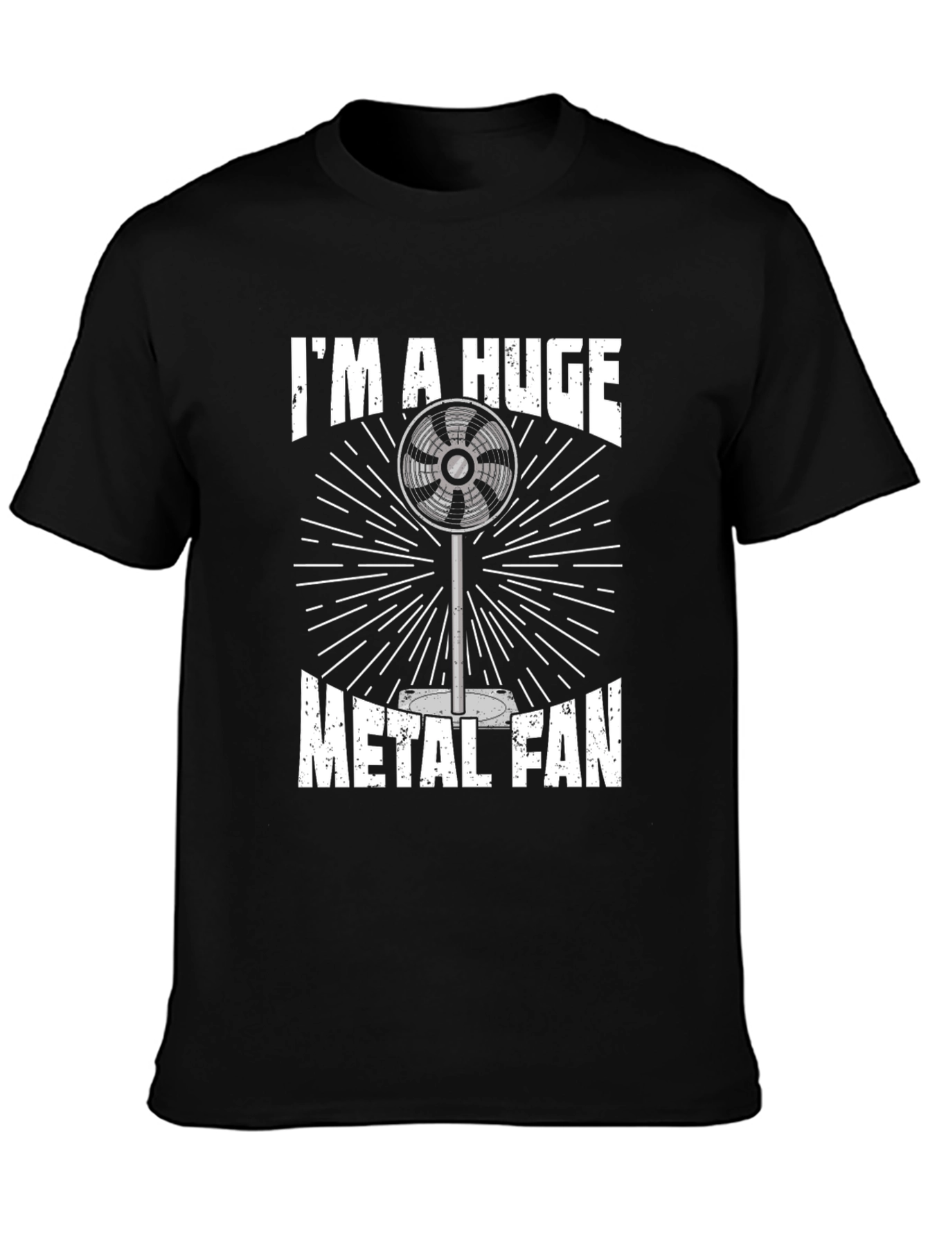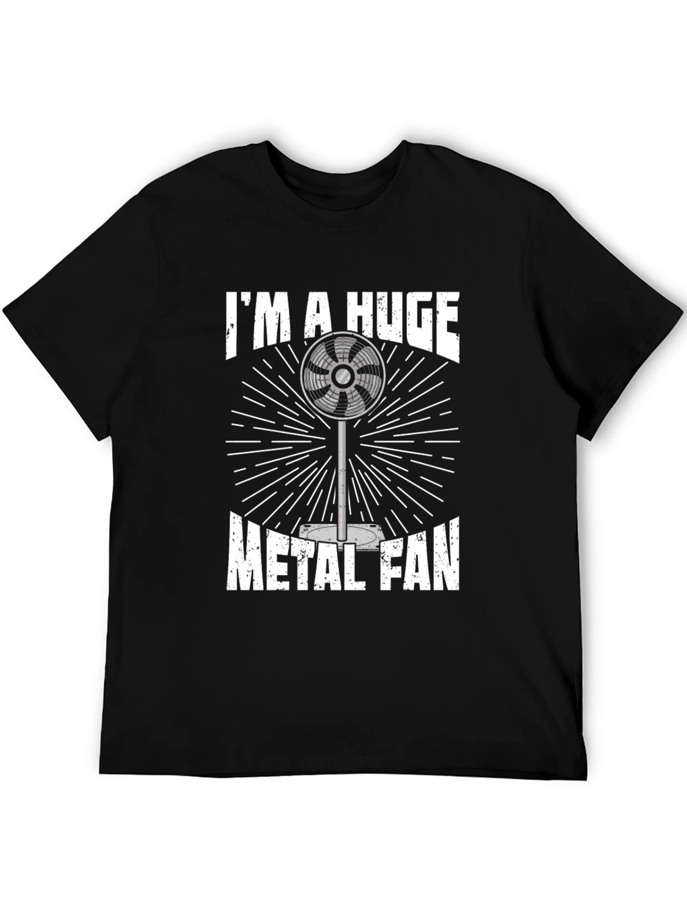 Show off your love for metal and humor with this unique graphic tee! This black t-shirt features a bold white design with the phrase "I'M A HUGE METAL FAN" surrounding a vintage-style metal fan illustration. The distressed print gives it a cool, worn-in feel. Made from a comfortable-looking fabric, this shirt is perfect for casual wear, concerts, or just hanging out with friends. A fun conversation starter and a great gift for any metalhead with a sense of humor. Get yours today and let everyone know you're a true metal enthusiast!
