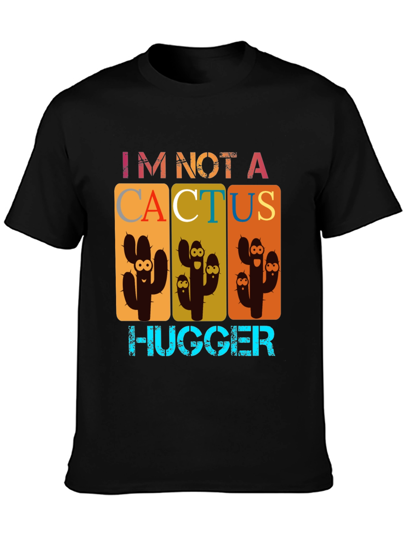 Show off your unique sense of humor with this "I'm Not A Cactus Hugger" graphic tee. This eye-catching black t-shirt features a playful design with three illustrated cacti in colorful block frames. The fun saying is displayed above and below the cartoonish cacti in coordinating trendy colors. Made from comfortable fabric, this short-sleeve shirt is perfect for casual wear. Whether you're out with friends, running errands, or just relaxing at home, this t-shirt will make a statement. Grab one for yourself, or as a fun gift!
