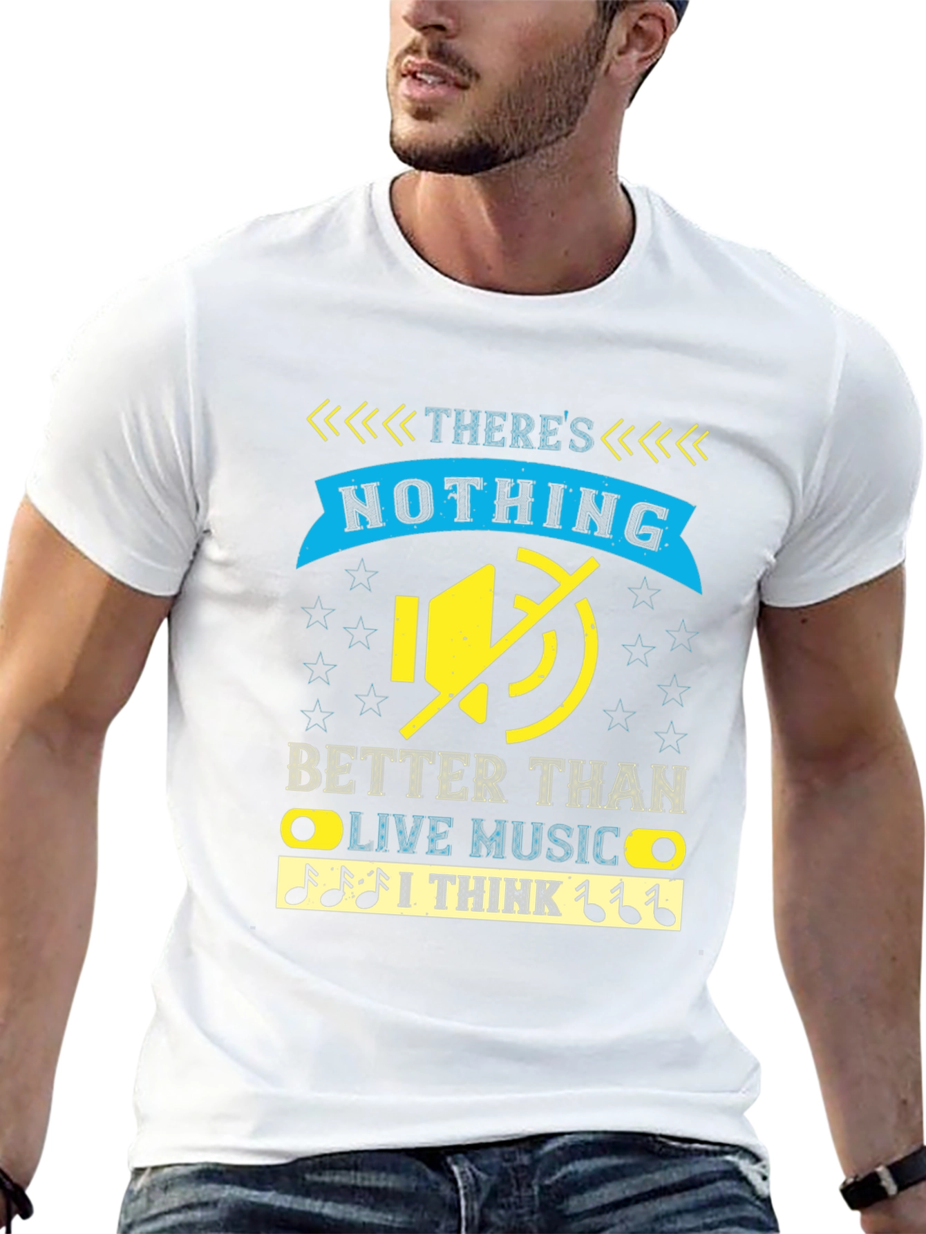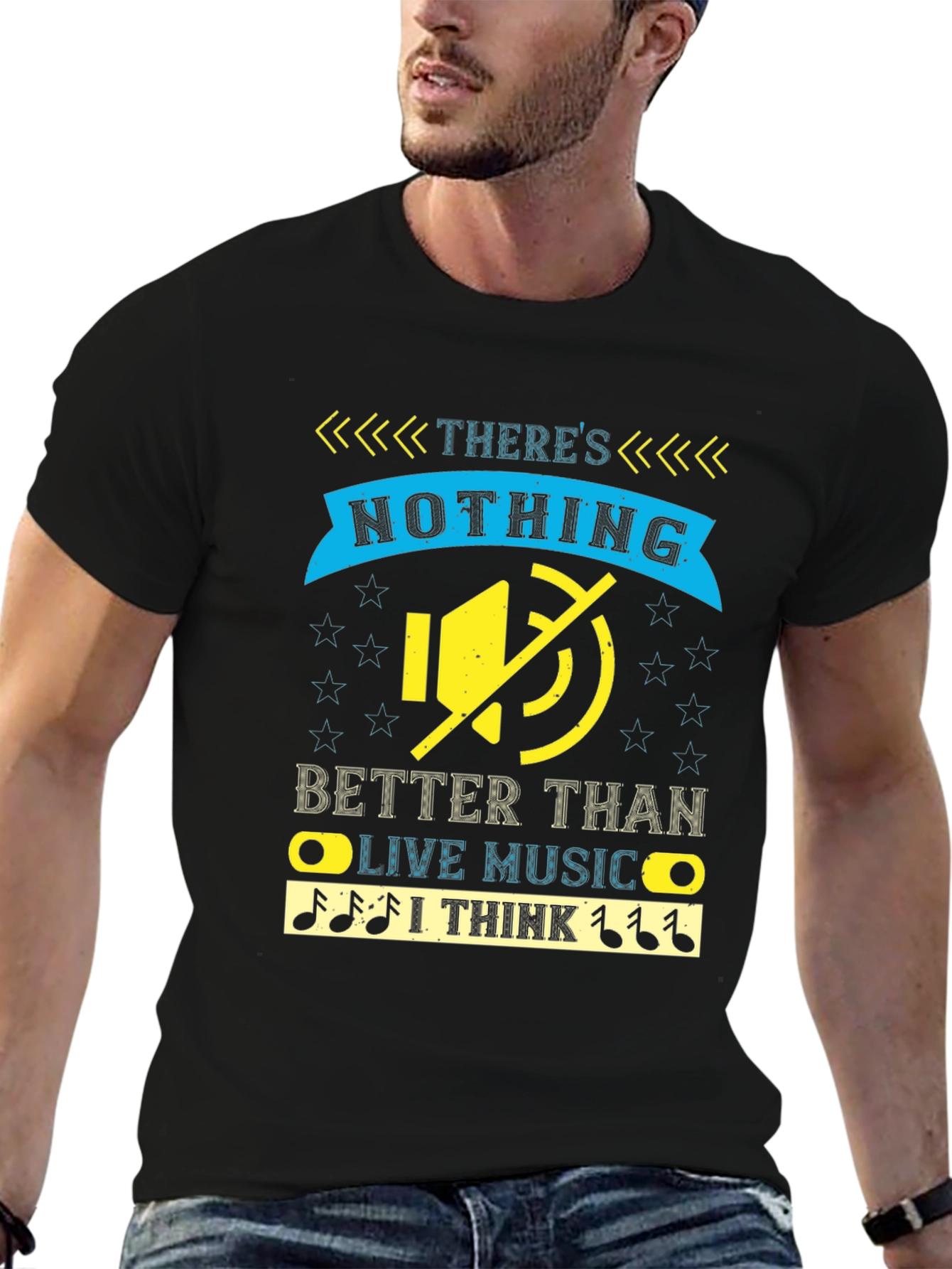 Show your love for live music with this stylish black t-shirt. The graphic design features the words 'There's Nothing Better Than Live Music I Think' in a unique, eye-catching font and layout. A crossed-out speaker icon adds a humorous touch. Crafted from a comfortable material, this tee is perfect for casual wear, concerts, music festivals, or just lounging around. The design incorporates stars and musical notes for an added flair. It's a great conversation starter for any music lover. Get yours today and let everyone know that nothing beats the experience of live music!