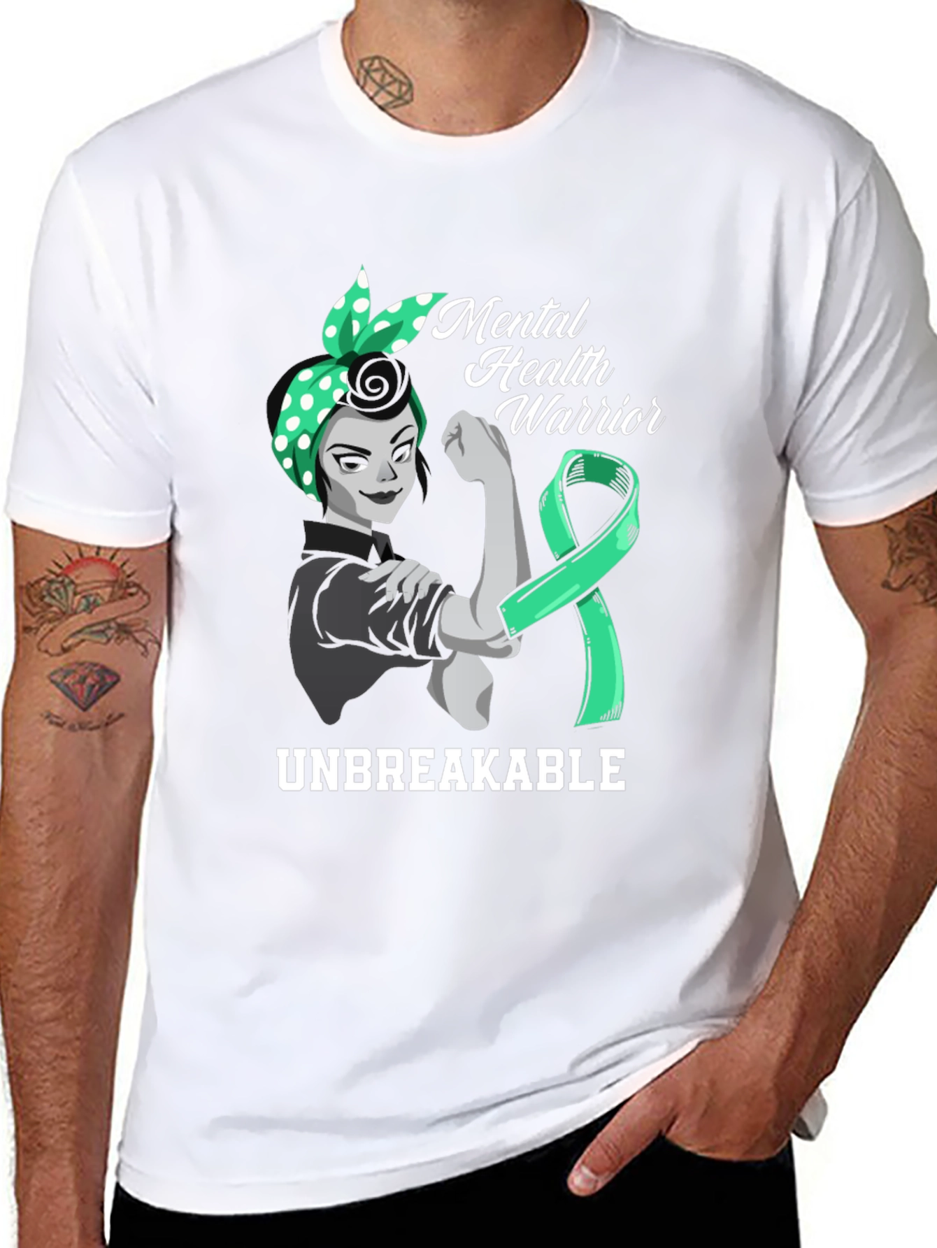Show your support with this empowering Mental Health Warrior T-shirt. The design features a Rosie the Riveter-inspired graphic alongside a green mental health awareness ribbon. "UNBREAKABLE" boldly accents the bottom of the design. Perfect for advocates, allies, or anyone looking to promote awareness and start conversations. Made from soft, breathable fabric, this tee ensures all-day comfort. Wear it to support groups, walks, or as a daily reminder to stay strong and promote mental well-being. A meaningful and stylish way to make a difference.