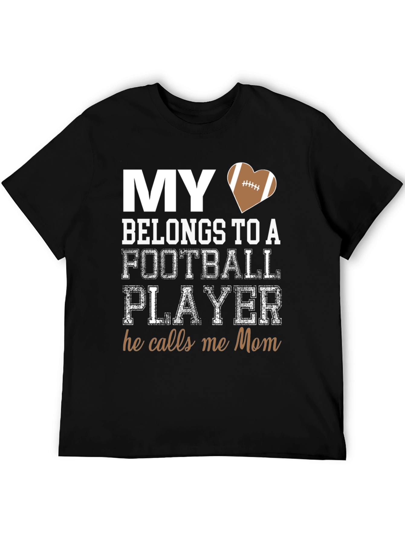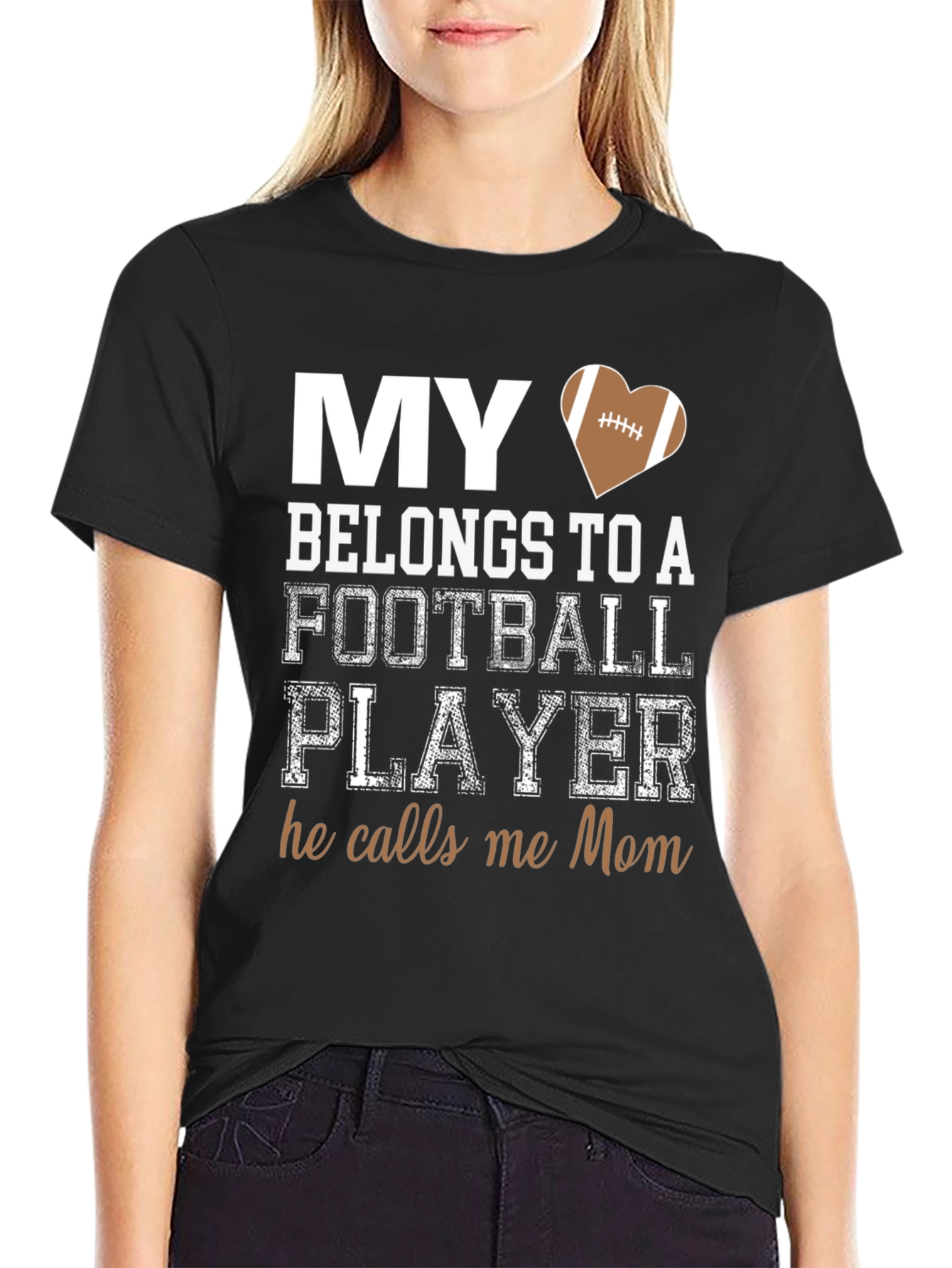 Show your love and support for your football player with this stylish and comfortable black t-shirt! Featuring the phrase "My Heart Belongs to a Football Player" with a football heart graphic, this tee is perfect for proud football moms. The design also includes the words "he calls me Mom", adding a personal touch. Made from soft and breathable fabric, this shirt is ideal for wearing to games, practices, or just around town to show your team spirit. It's a great gift for any football mom!