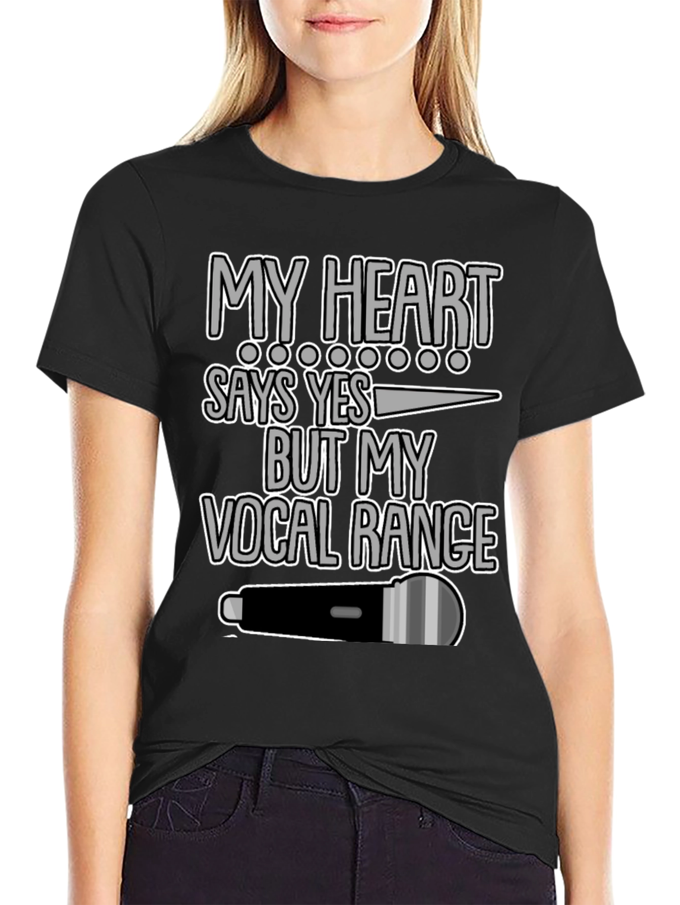 Express your love for singing with this unique black graphic t-shirt! The shirt features a clever design with the phrase 'MY HEART SAYS YES BUT MY VOCAL RANGE' and an illustration of a microphone. This tee is perfect for singers, karaoke enthusiasts, or anyone who appreciates a good pun. Made from comfortable materials, this short-sleeved shirt is great for casual wear, music events, or as a fun gift for the musically inclined. Stand out and show off your passion with this stylish and witty t-shirt!