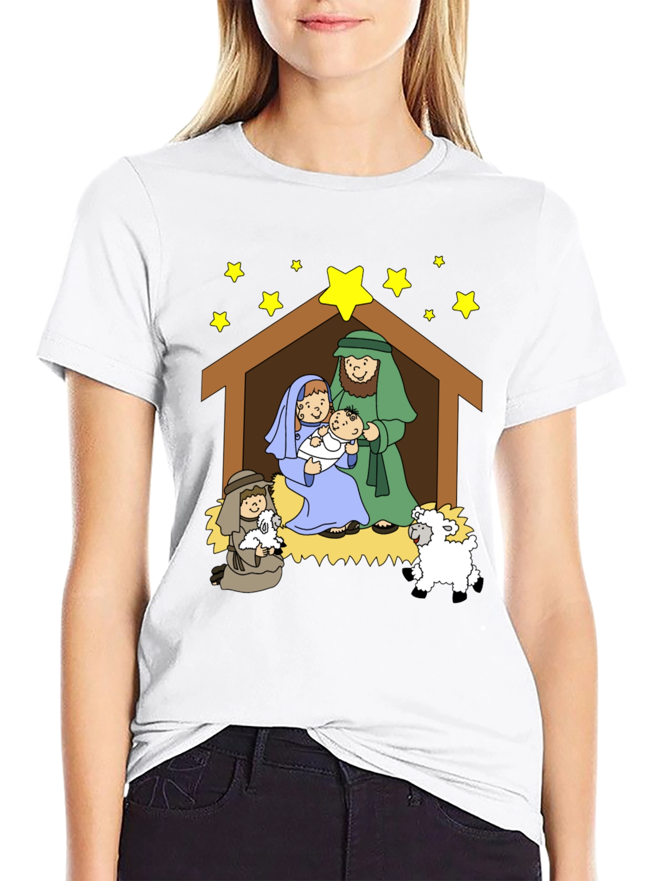 Celebrate the holiday season with this festive black T-shirt! The shirt features a cartoon-style nativity scene, complete with Joseph, Mary, baby Jesus, a shepherd, and a fluffy white sheep. Yellow stars twinkle above the cozy stable, creating a cheerful and heartwarming design. Made from a comfortable fabric, this tee is perfect for casual wear during Christmas gatherings, holiday events, or simply to spread some seasonal cheer. A fun and unique way to show your holiday spirit, this T-shirt is sure to be a conversation starter!