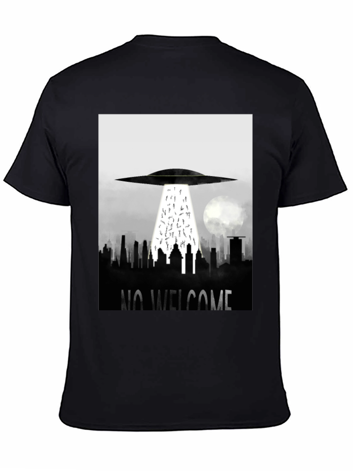 Show off your unique style with this eye-catching black t-shirt. The shirt features a striking graphic of a UFO hovering over a city skyline with the words "NO WELCOME" below. A bright light emanates from the UFO, seemingly capturing figures. This tee is perfect for anyone who loves sci-fi, urban themes, or making a bold statement. The design is printed on what appears to be a soft cotton fabric, ensuring a comfortable fit. Wear it casually with jeans, or dress it up with a jacket for a night out. Express your individuality with this distinctive and conversation-starting t-shirt!