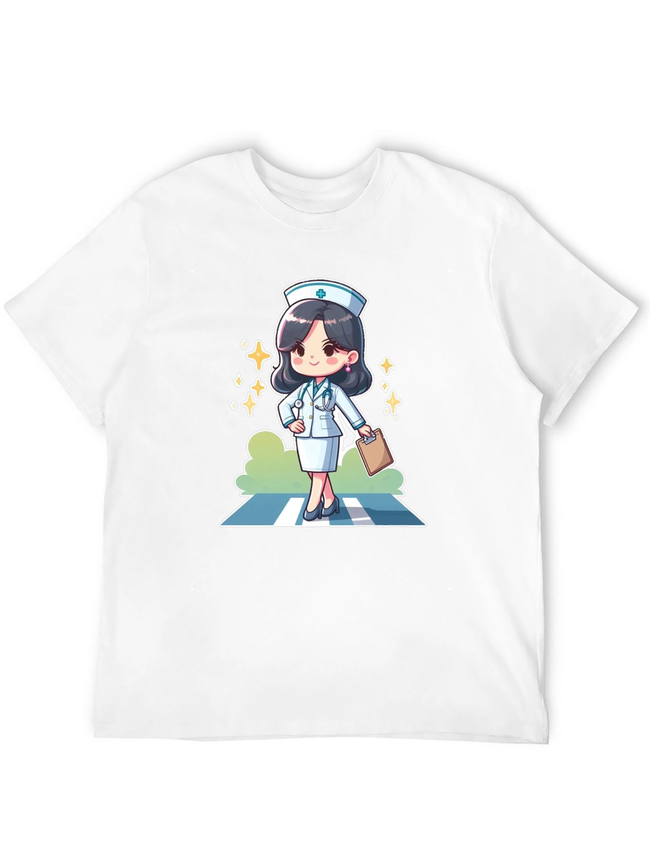 Show off your love for the medical profession with this stylish black t-shirt! Featuring a vibrant cartoon graphic of a cute nurse in uniform, complete with a lab coat, stethoscope, and clipboard, this tee is perfect for medical professionals or anyone who appreciates a fun and unique design. The high-quality print ensures the image stands out, while the comfortable fabric makes it ideal for everyday wear. Whether you're heading to work, running errands, or just relaxing at home, this t-shirt is a great way to express your personality and passion.