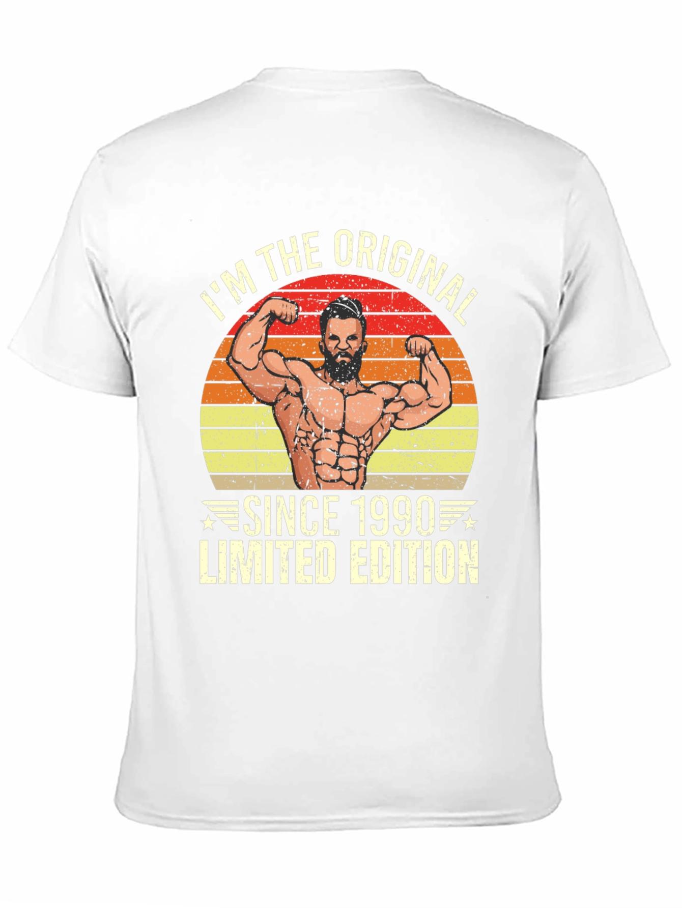 This black T-shirt features a unique and eye-catching design, perfect for those born in 1990. The shirt displays a muscular cartoon figure flexing, set against a vintage sunset backdrop. The bold text reads "I'M THE ORIGINAL" above the figure, and "SINCE 1990 LIMITED EDITION" below, making it an ideal birthday or anniversary gift. The design has a distressed, worn look, giving it a retro feel. Made from comfortable materials, it's perfect for casual wear or a fun addition to any wardrobe. Show off your original style with this limited-edition piece!