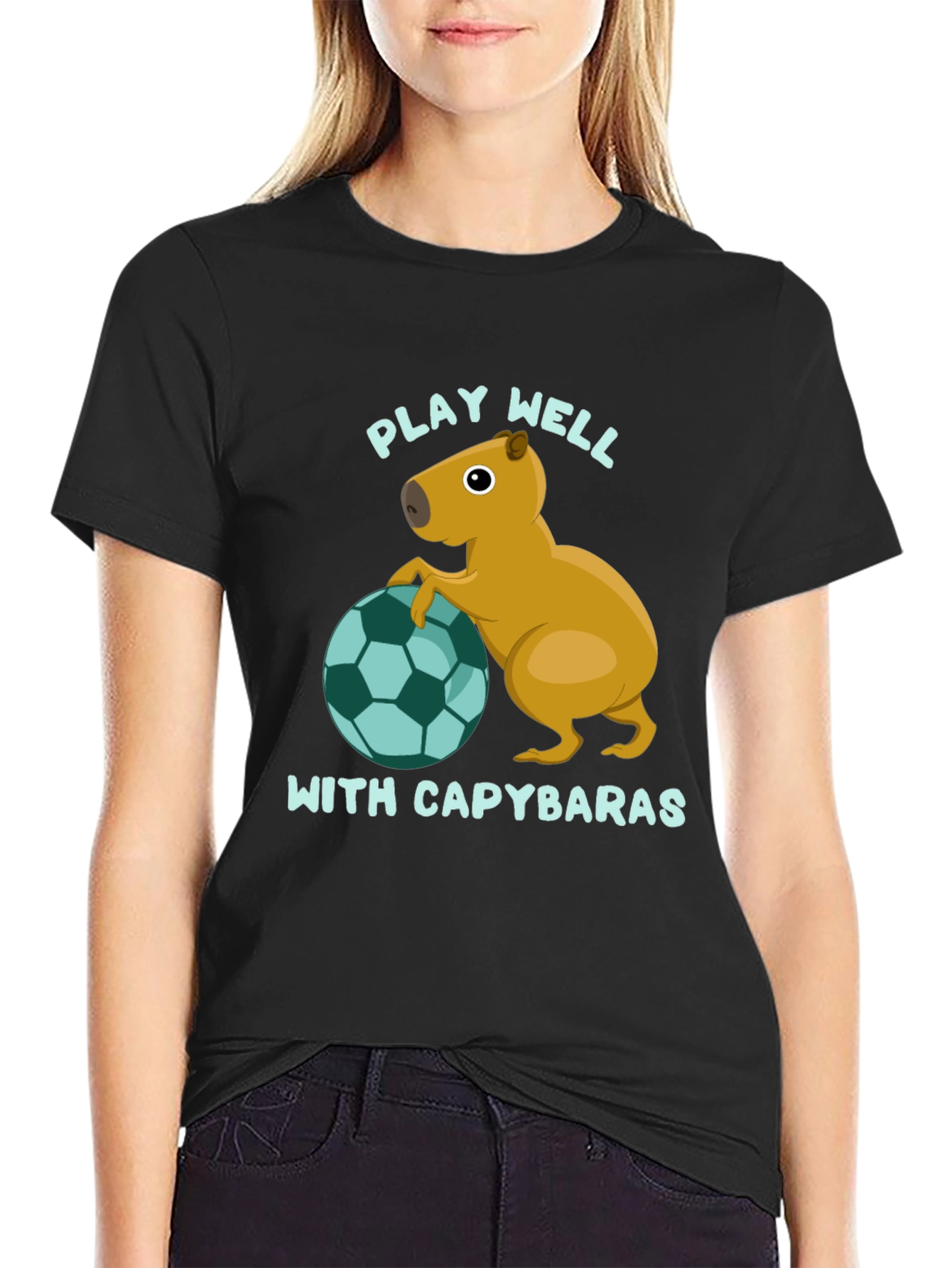 Show off your love for capybaras with this playful graphic tee! This black t-shirt features a cute capybara illustration leaning against a teal and black soccer ball. The phrase "PLAY WELL WITH CAPYBARAS" is printed in a light teal above and below the capybara. Made from a comfortable-looking fabric, this t-shirt appears ideal for casual wear. It's perfect for everyday wear, sporting events, or just lounging around. Get yours now and spread the capybara love!