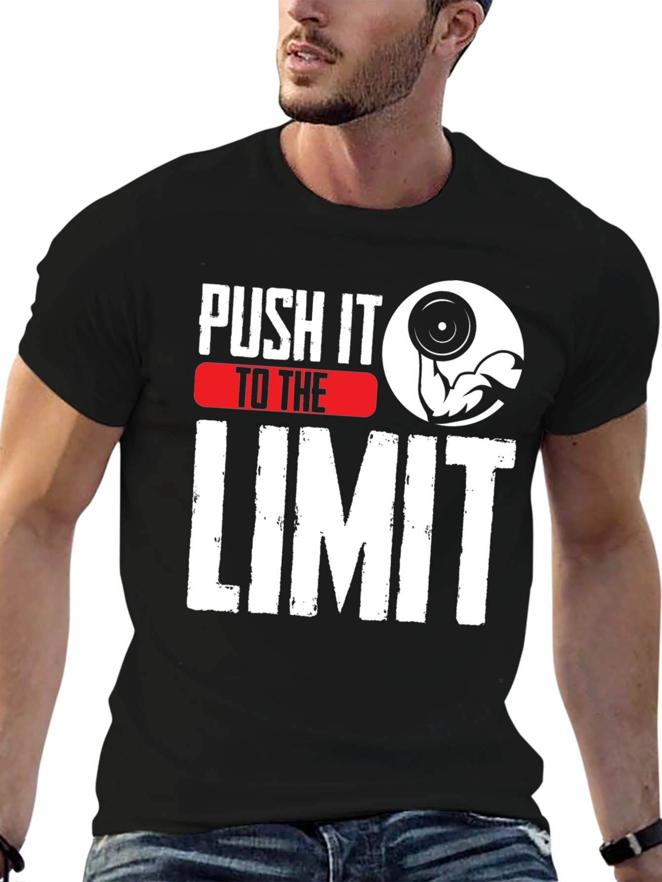 Dominate your next workout with this motivational t-shirt! This black tee features the bold white text "Push It To The Limit," partially underlined in striking red. An image of a muscular arm lifting a barbell adds to the design's intensity. This tee is perfect for hitting the gym or showing off your fitness dedication. Get ready to break a sweat in this stylish and inspiring shirt. Made for comfort and durability, it will hold up to any workout.
