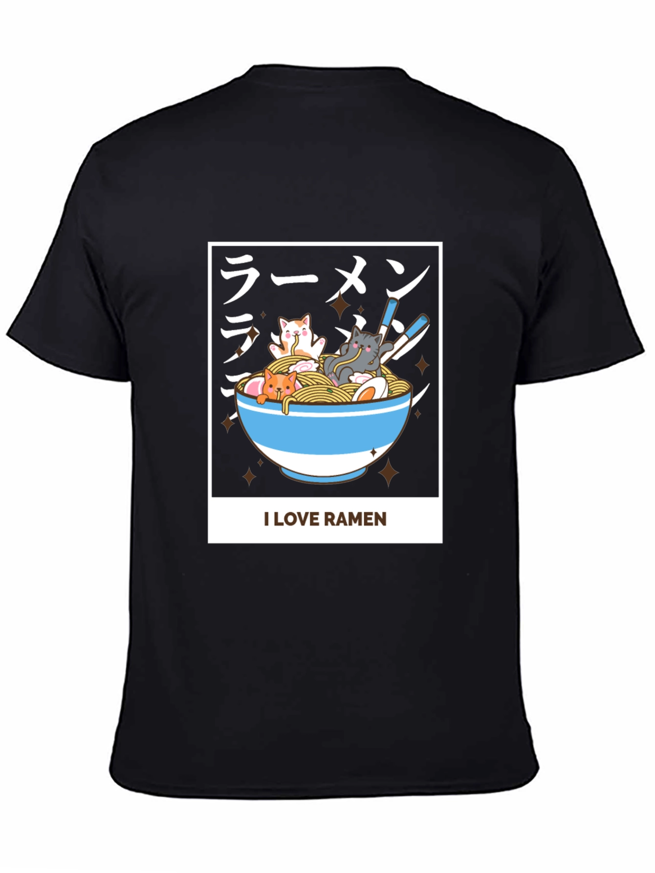 Show your love for ramen and cats with this unique T-shirt. This black tee features a cute graphic of three kittens enjoying a bowl of ramen. The design includes Japanese text and the words "I LOVE RAMEN" for added flair. Made from a comfortable fabric, this shirt is perfect for casual wear. The playful design is a great conversation starter and a must-have for ramen enthusiasts. Ideal for everyday outings, casual gatherings, or as a gift for your favorite cat and noodle lover. Get yours today and wear your passion proudly!