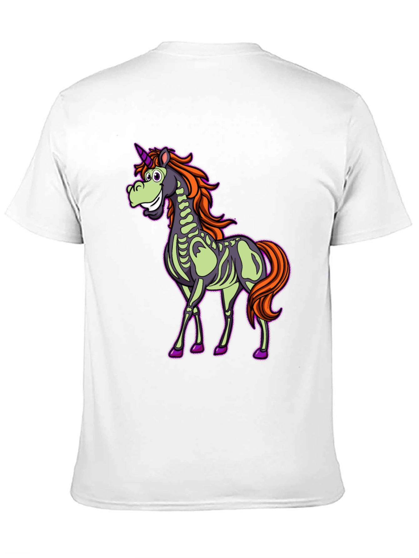 Stand out with this unique skeleton unicorn graphic tee! The design features a cartoon-style unicorn with a playful skeleton print overlayed on its body, complete with an orange mane and tail. The print offers a cute twist on traditional Halloween themes. Made from comfortable materials, this t-shirt is perfect for casual wear, themed parties, or just expressing your fun personality. Pair it with jeans or shorts for a cool, effortless look. Get ready to turn heads and spark conversations with this quirky and eye-catching piece!