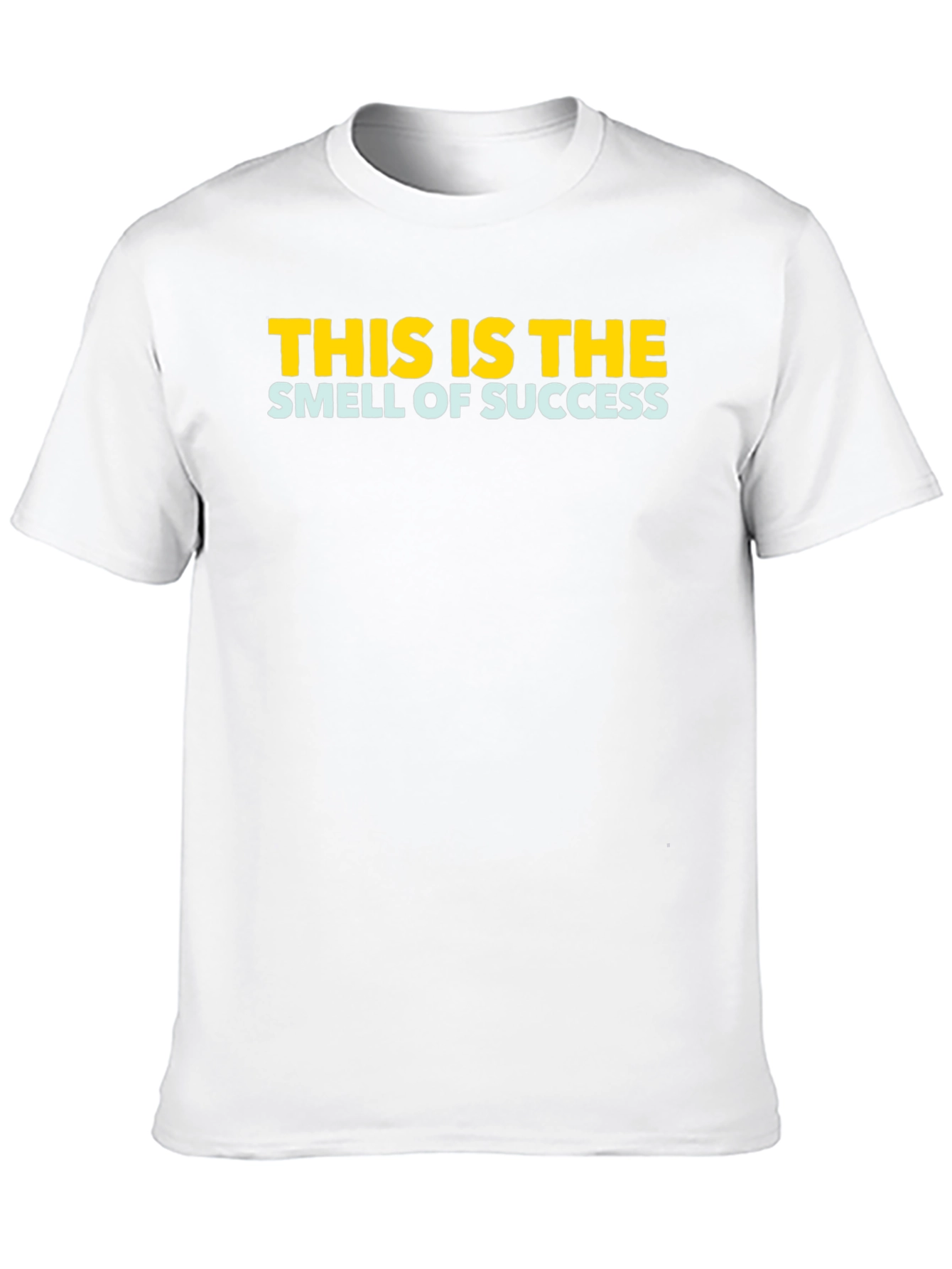 Declare your ambition with this bold black graphic tee! Featuring the phrase "THIS IS THE SMELL OF SUCCESS" emblazoned across the chest in contrasting bright yellow and light blue lettering, this shirt makes a statement. Crafted from what appears to be a soft and comfortable cotton blend, this classic fit tee is ideal for casual wear. Perfect for expressing your drive and positive mindset, whether you're hitting the gym, running errands, or just relaxing. Wear your success – order yours today!